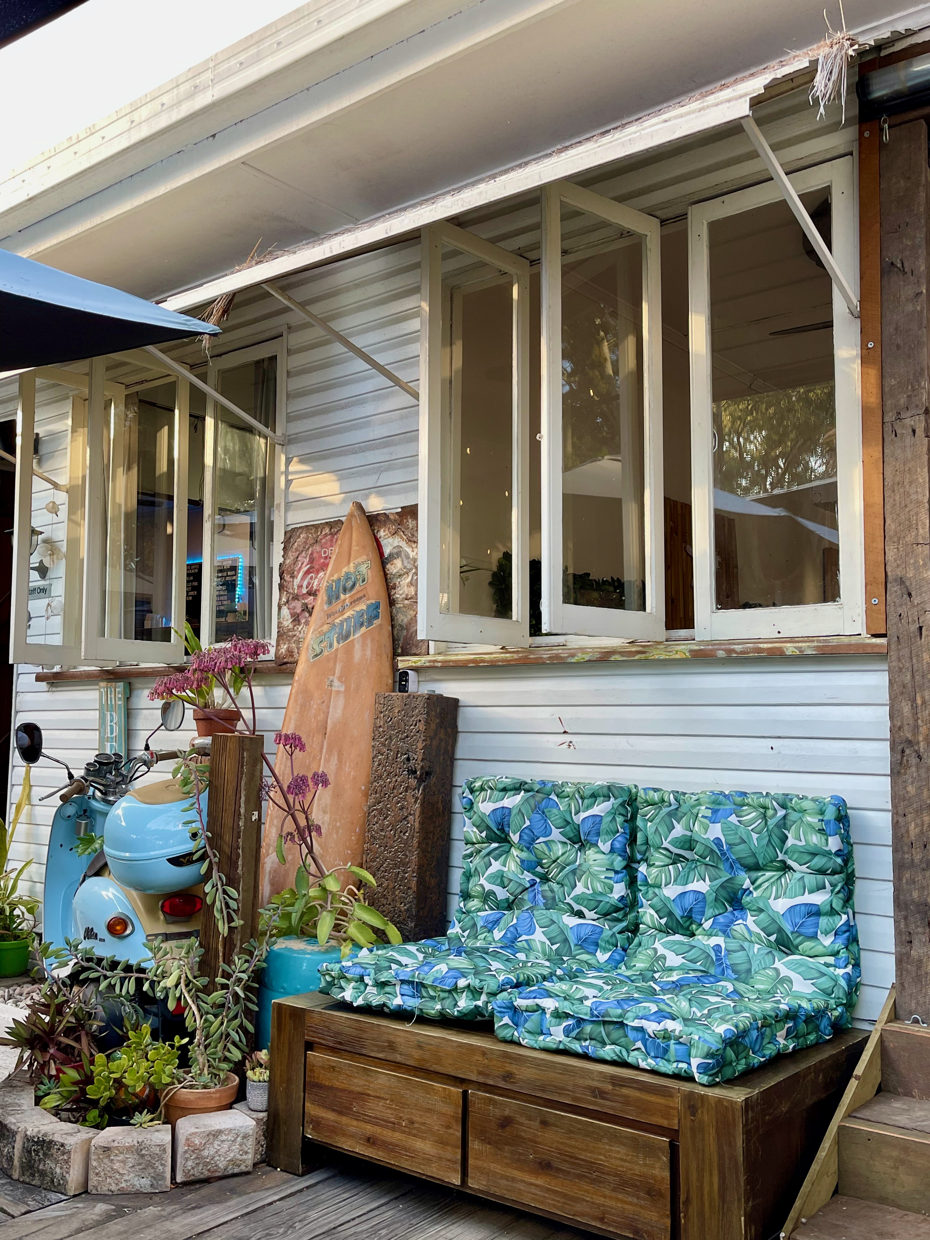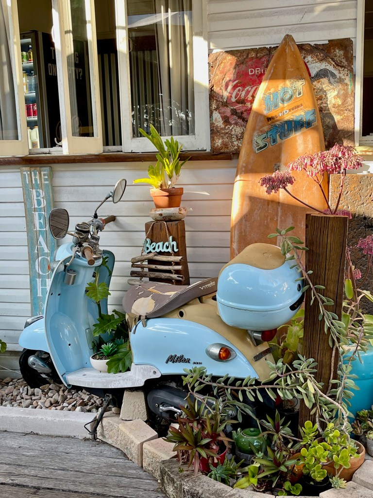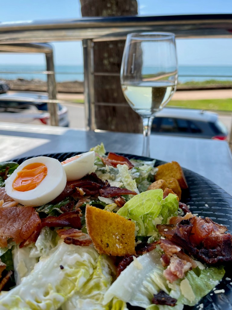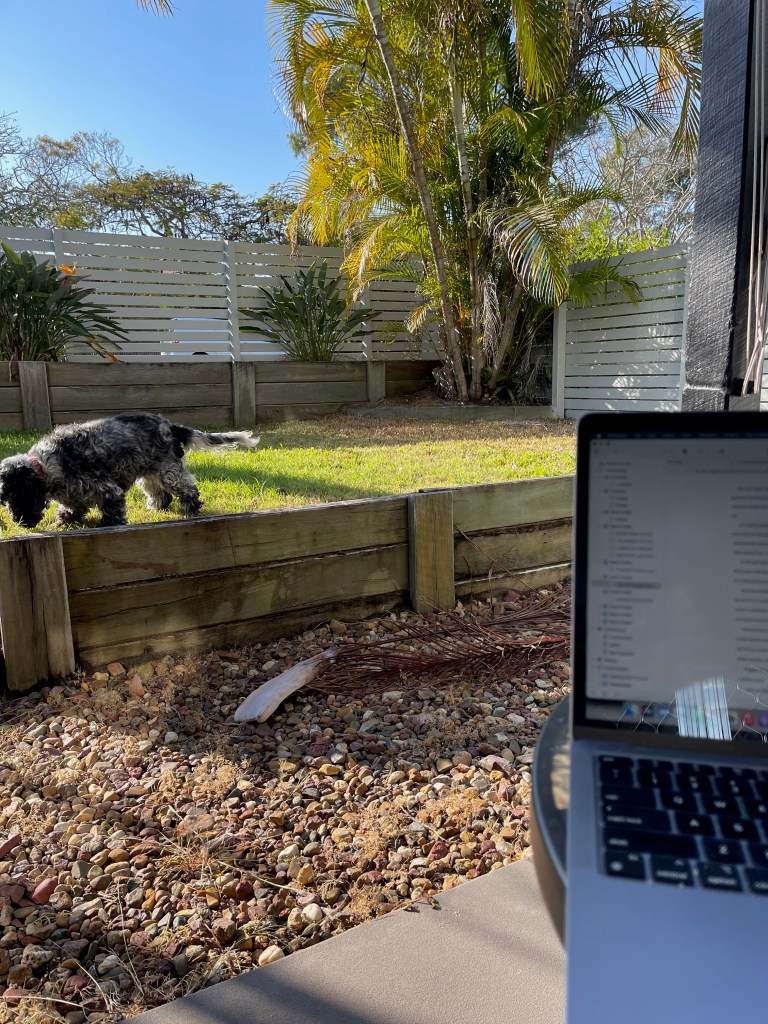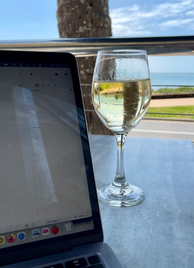 I took myself out for lunch on Wednesday at the Bayside in Urangan and got plenty of words written (fuelled no doubt by a couple of glasses of wine). During the week I also wrote at Cody’s – the cute coffee shop down the road from Sarah’s – and in her backyard.