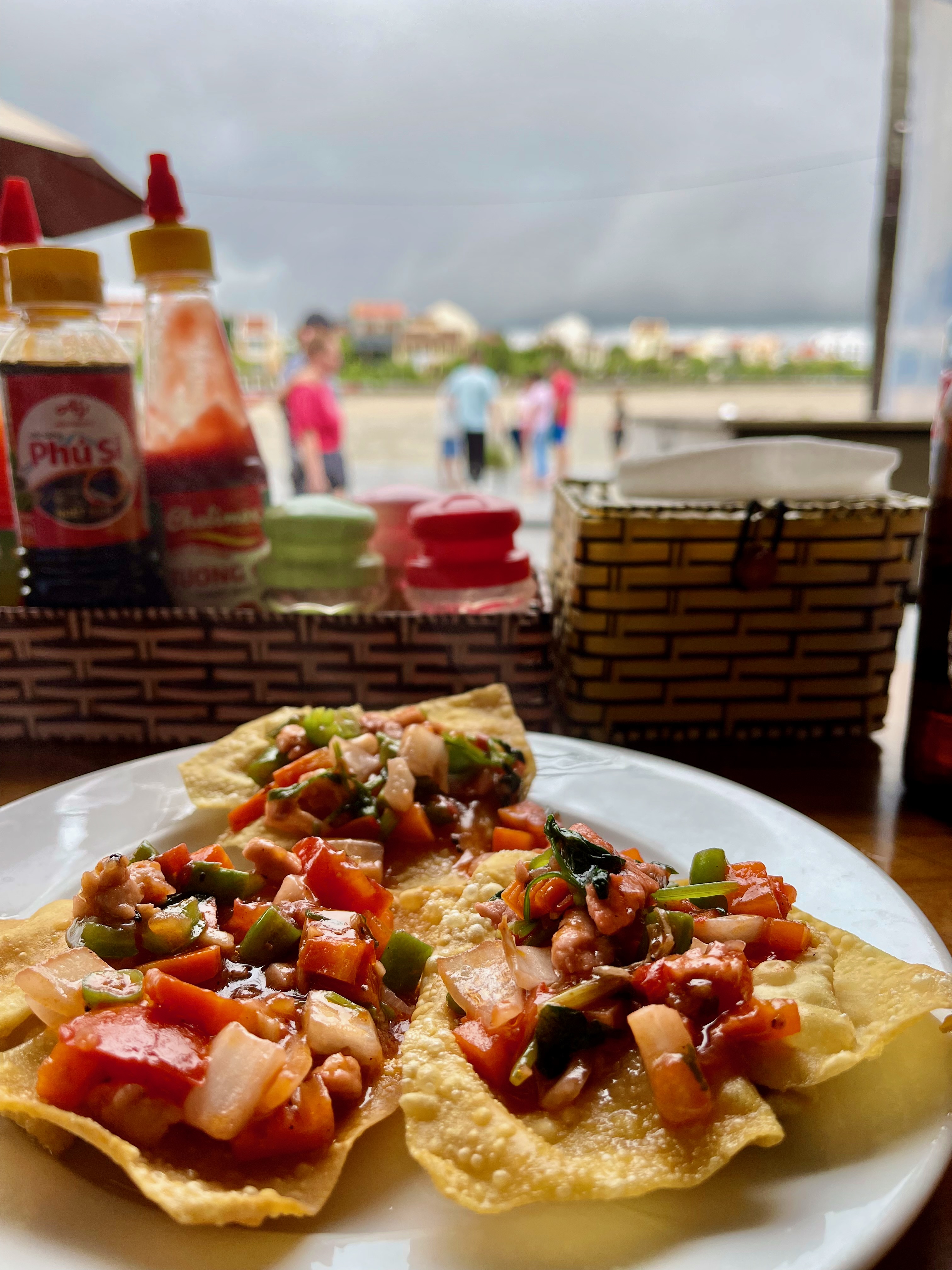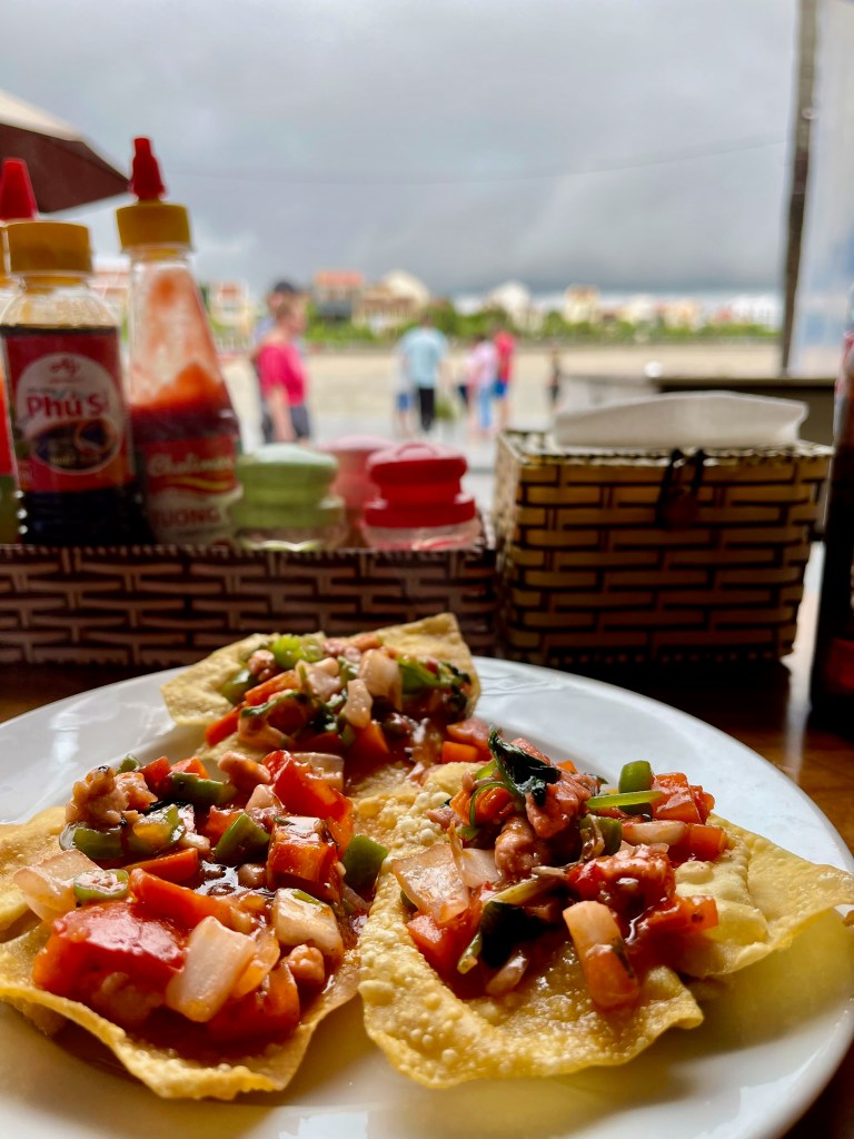 Deep-fried and covered in a salsa-like topping of vegetables and sweet and sour shrimp these crispy treats are known as Hoi An pizza and are perfect with beer.