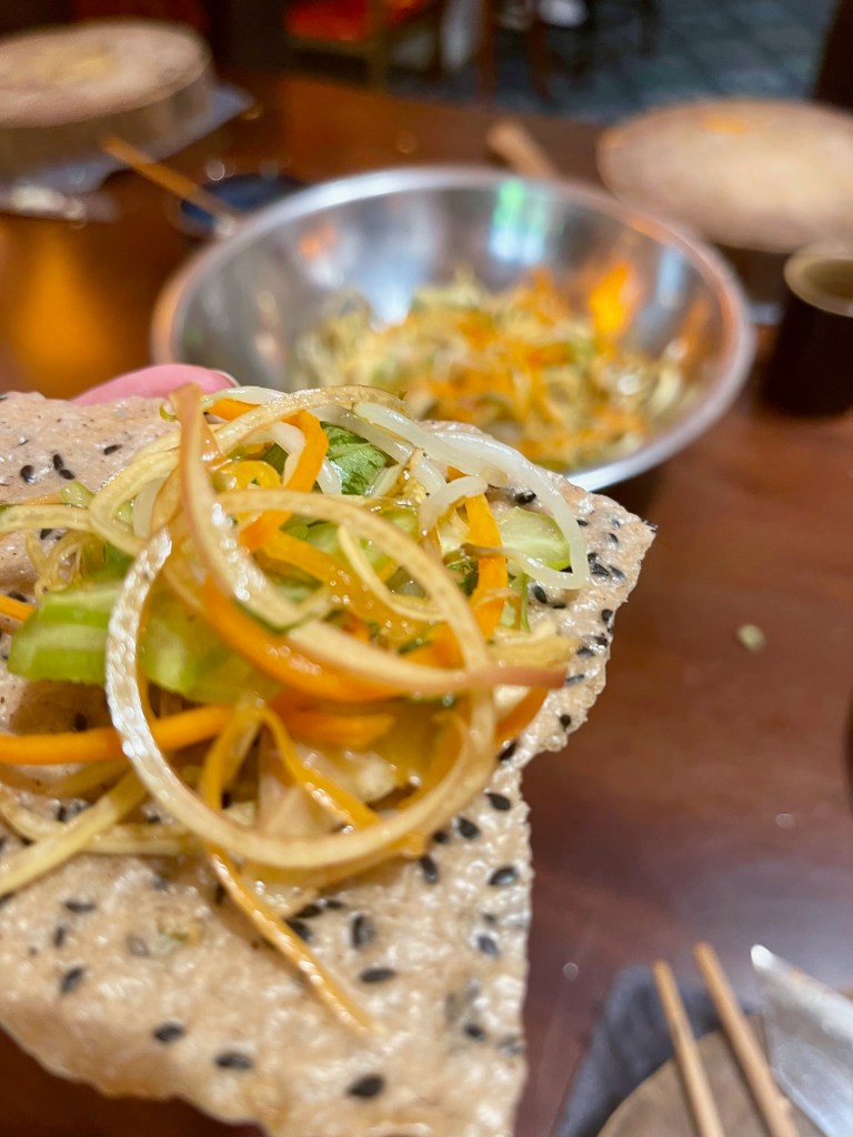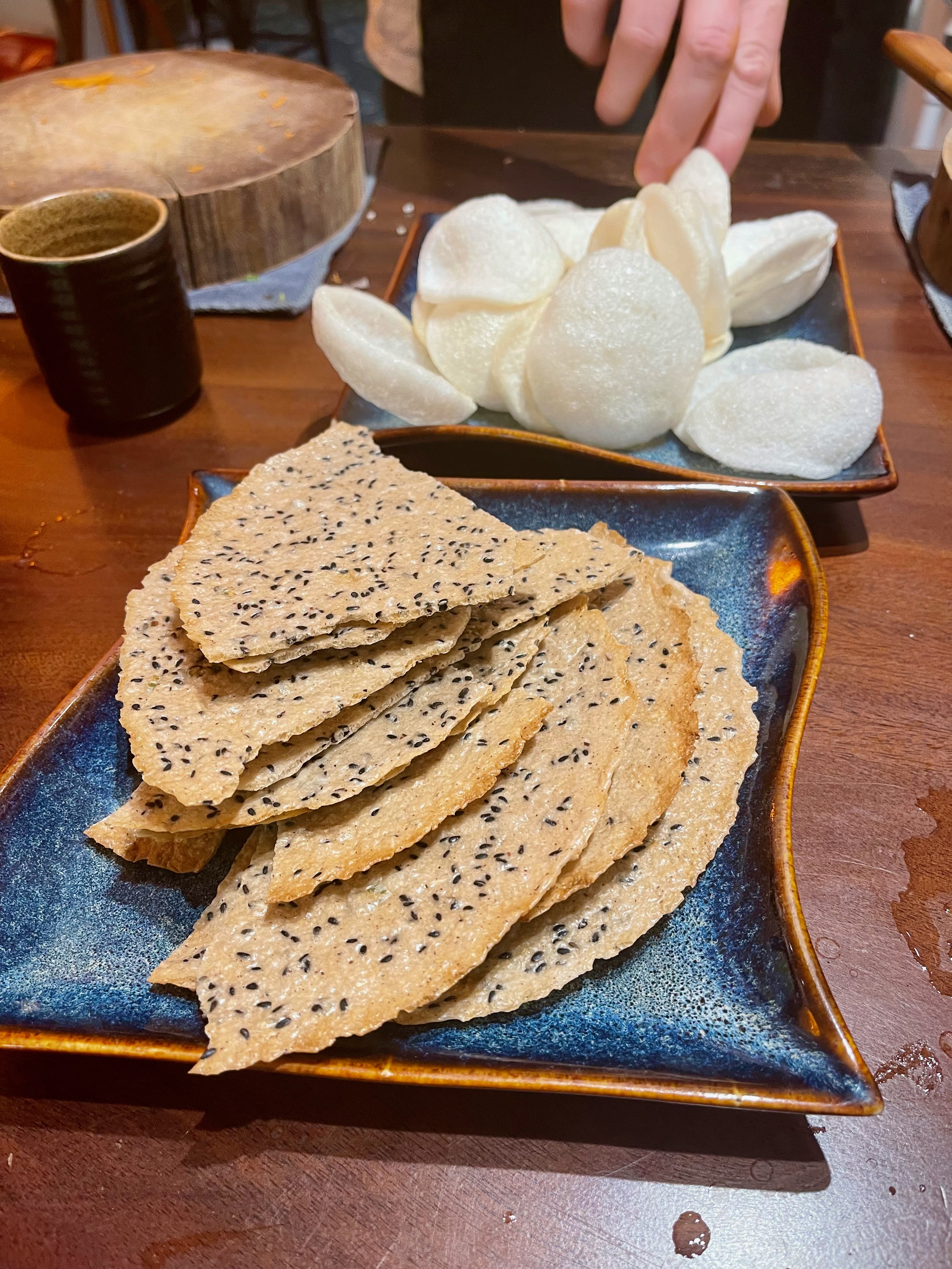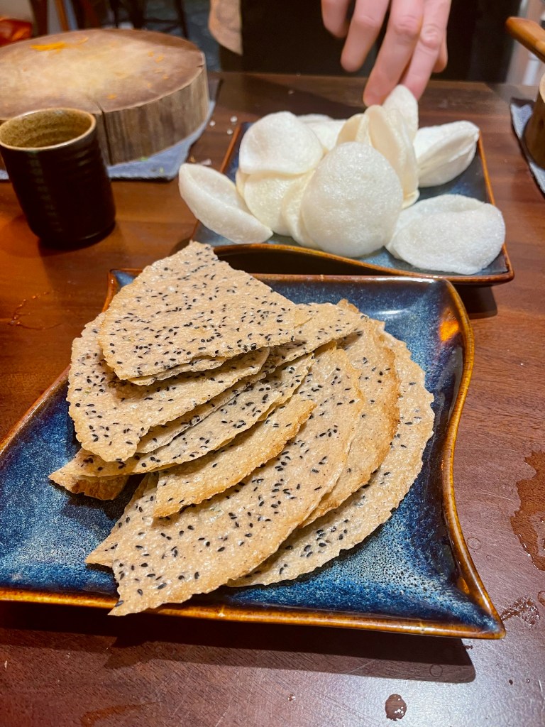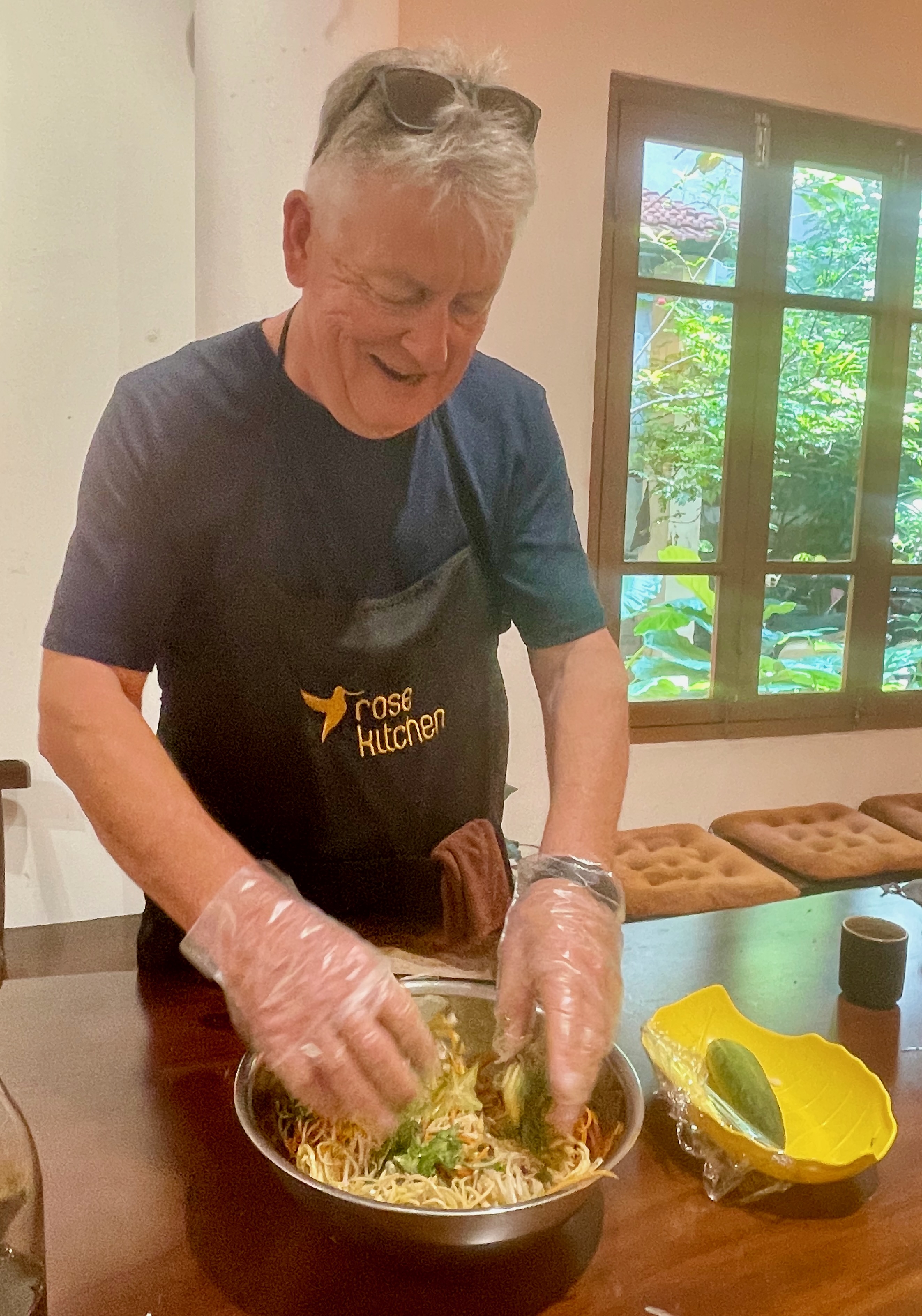 First up we get started on the banana flower salad. I’ve made this at home before, but had struggled with the preparation of the banana flower and now know I didn’t make the most of this ingredient. We eat it with sesame rice crackers and prawn crackers. I’ve included the recipe below.