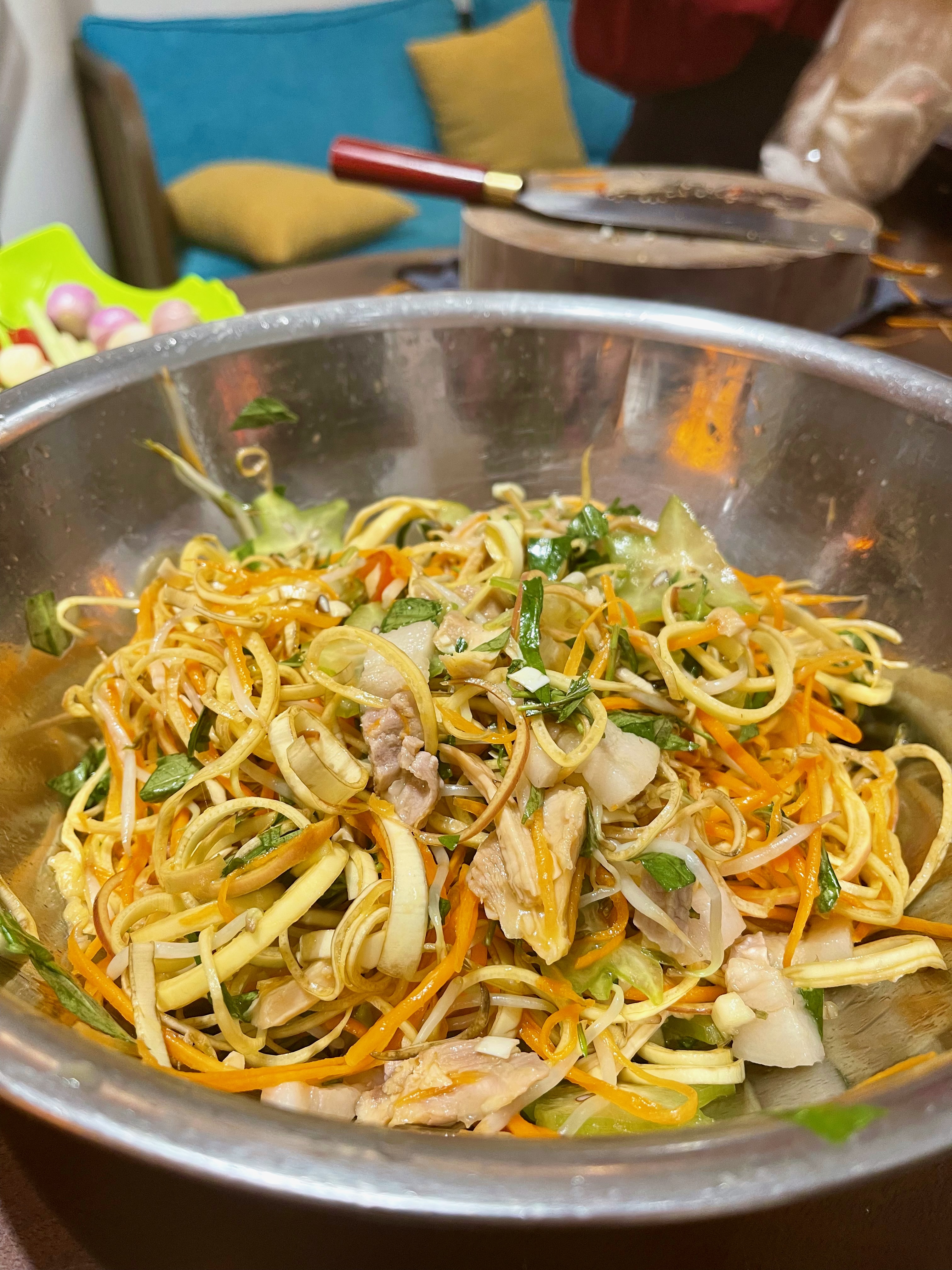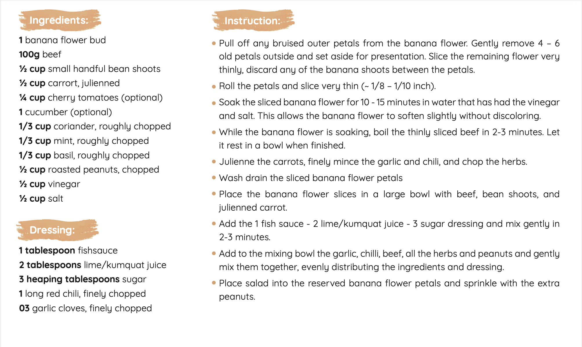 Banana flower can be difficult to get, but we’re fortunate in that it is available at our local farmer’s market. While the recipe below contains cooked beef, we used shredded cooked chicken.