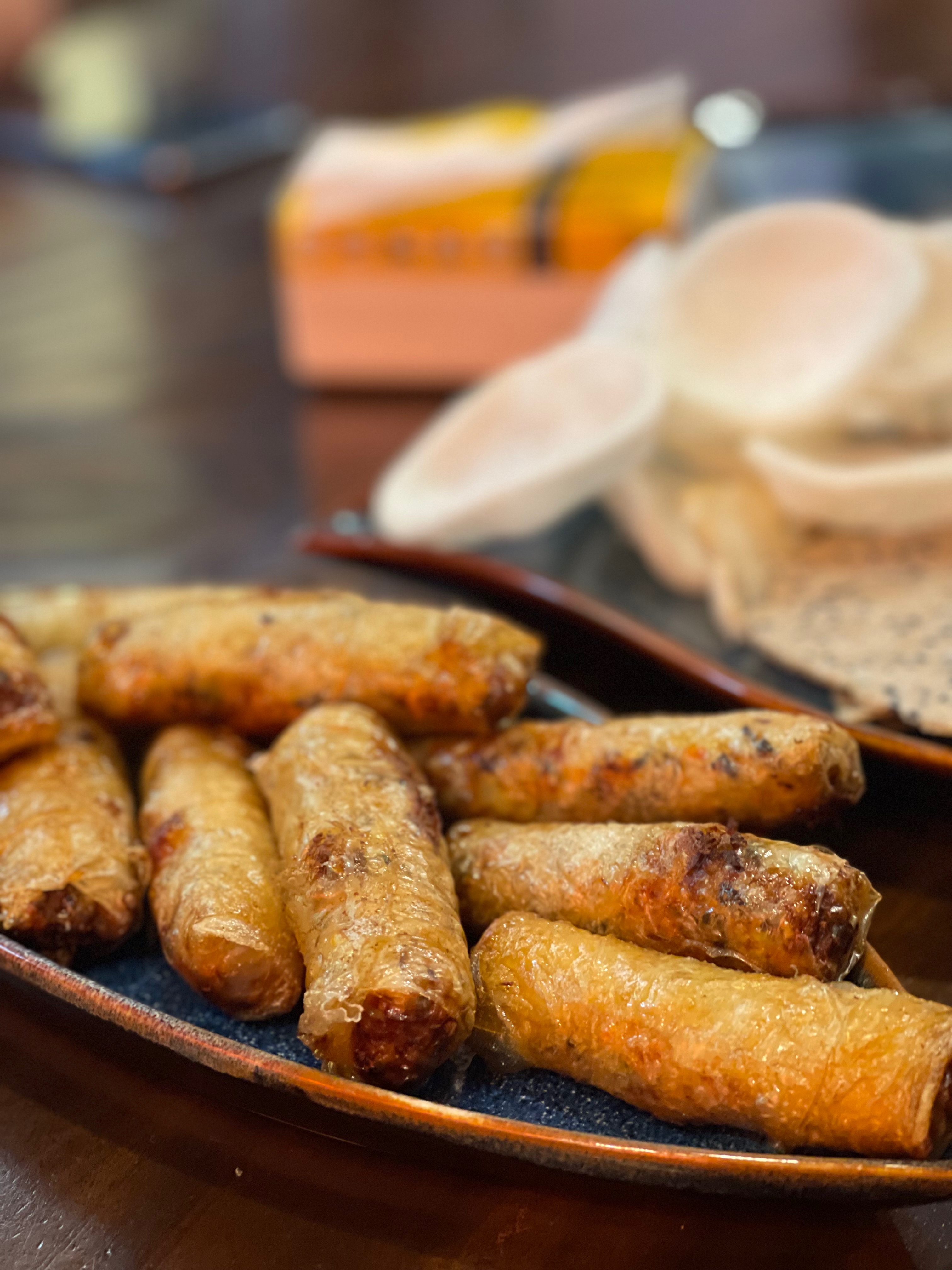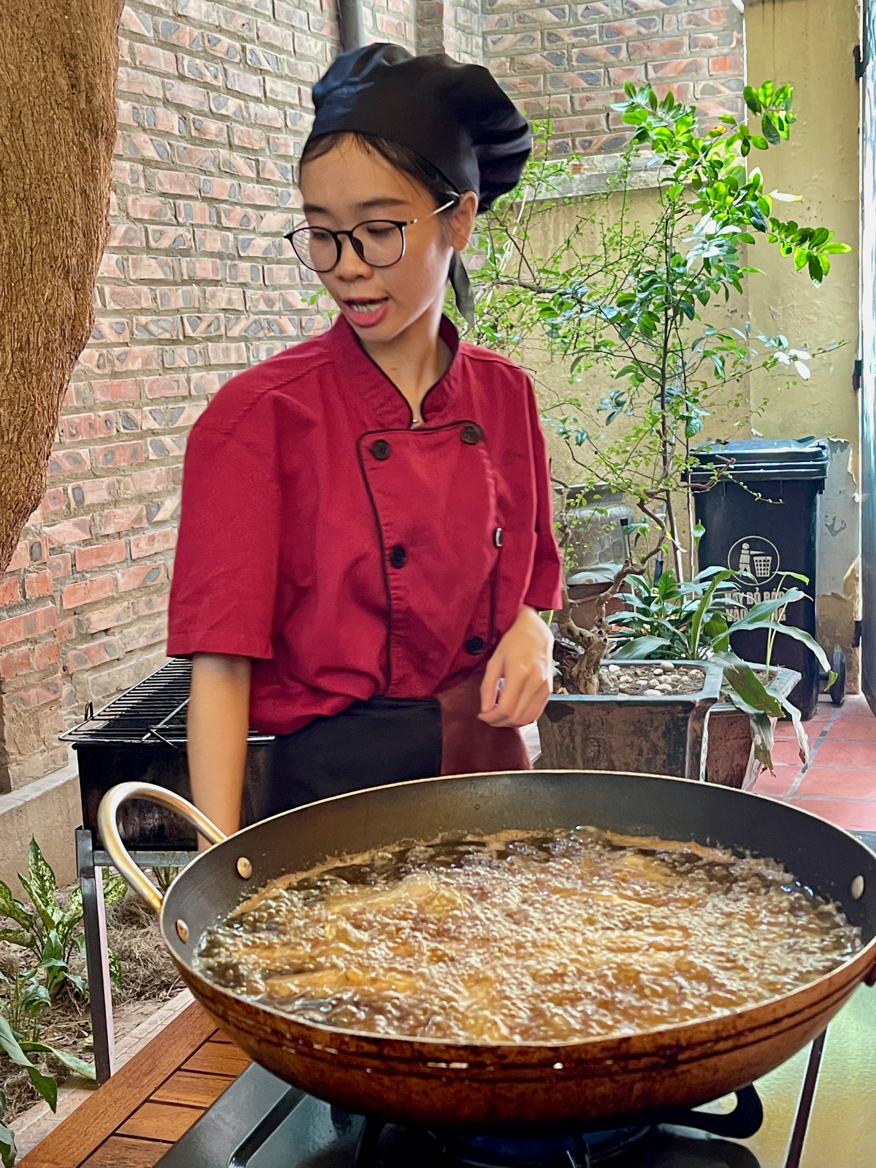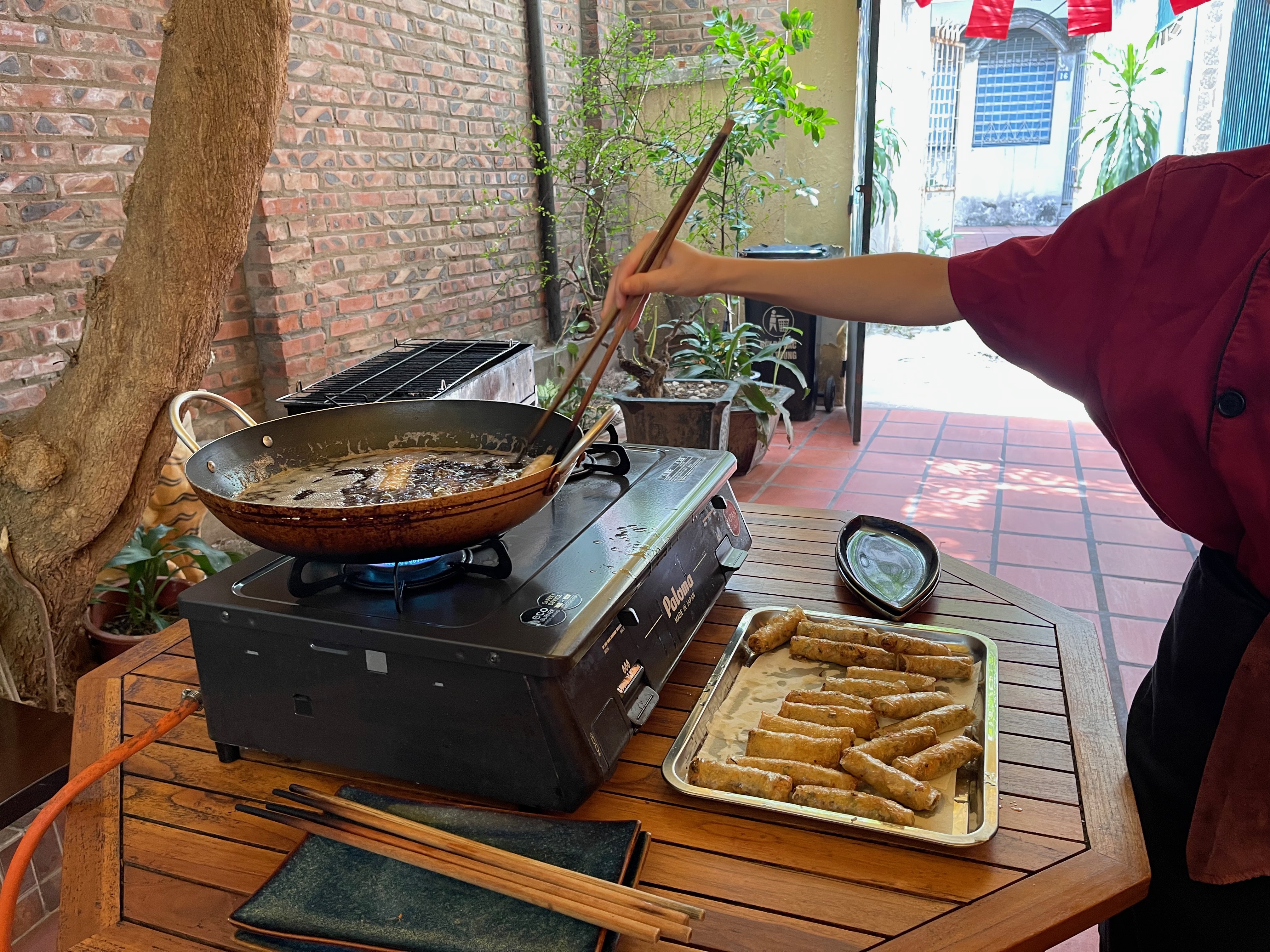As we all oversee the barbecuing of the pork patties and pork belly strips, Norah fries the spring rolls.