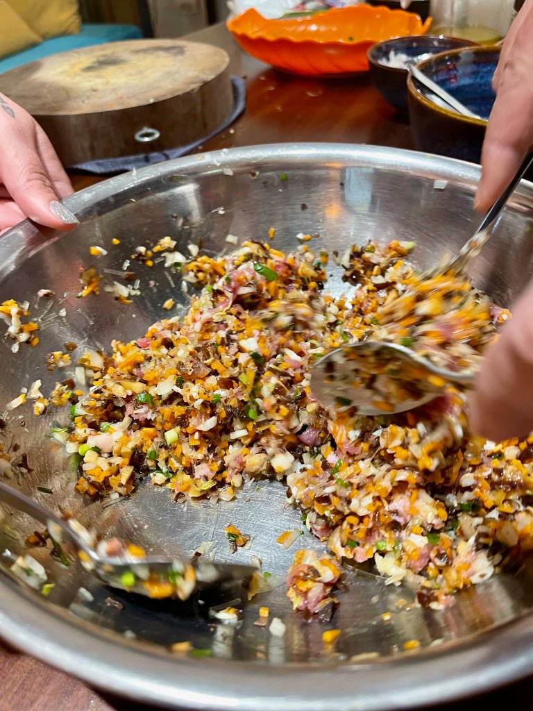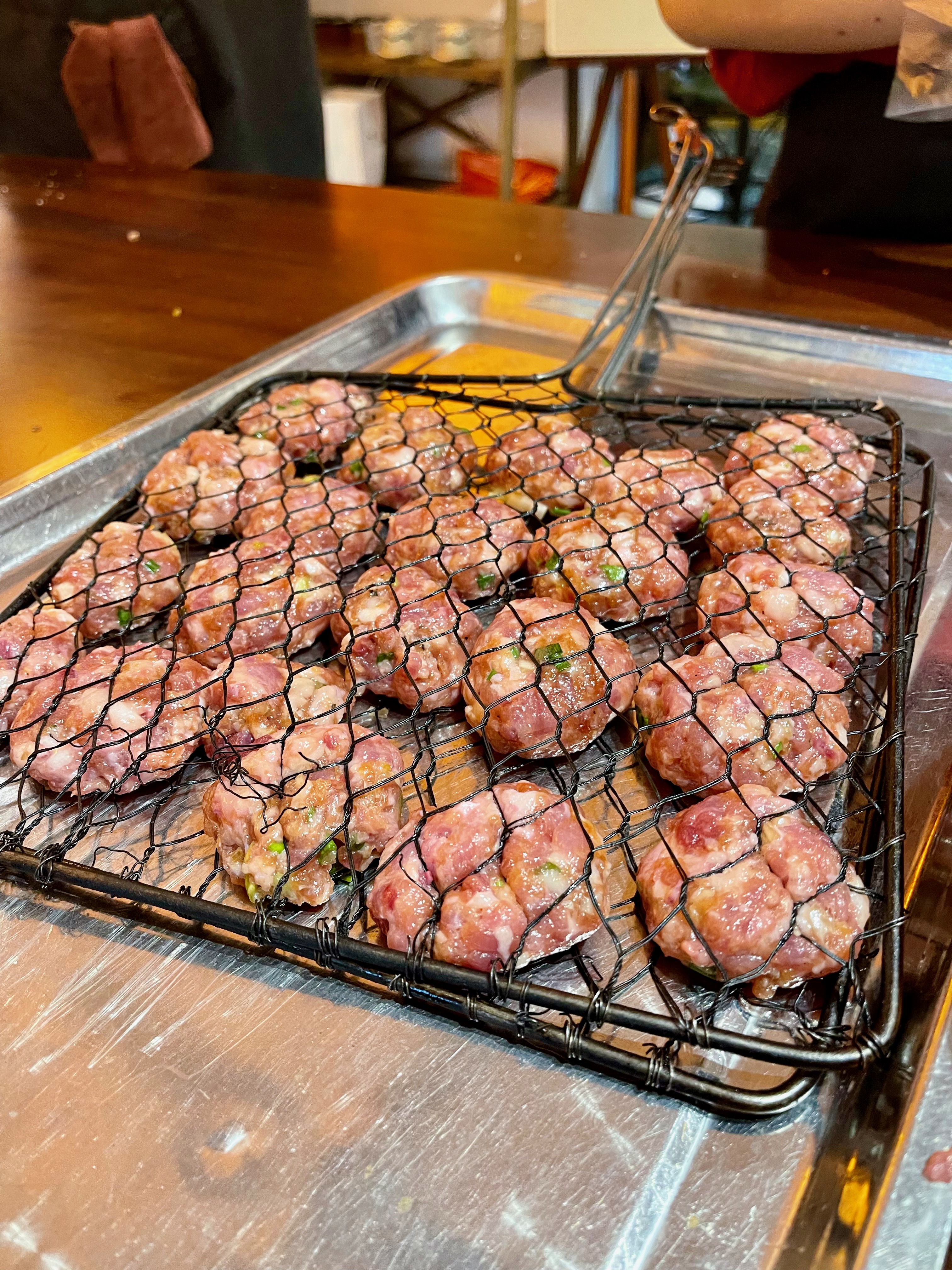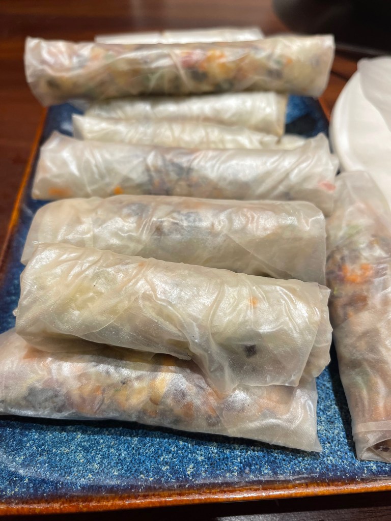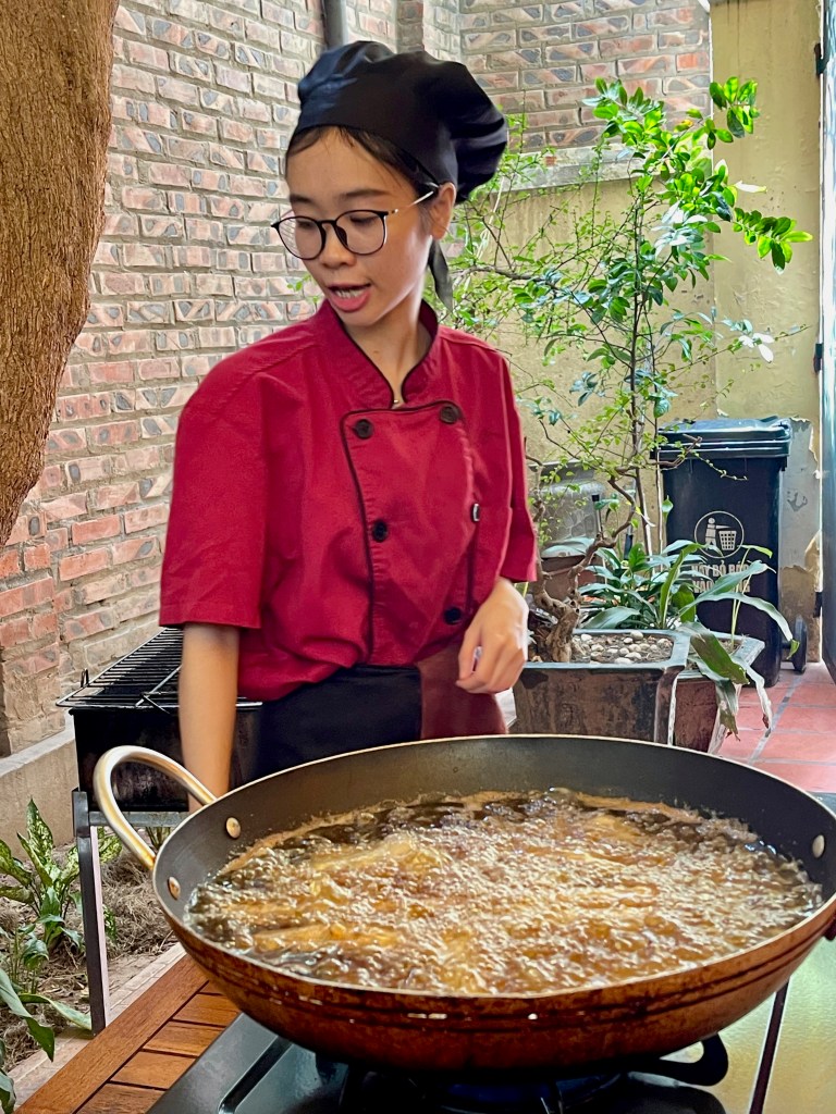 As we all oversee the barbecuing of the pork patties and pork belly strips, Norah fries the spring rolls.