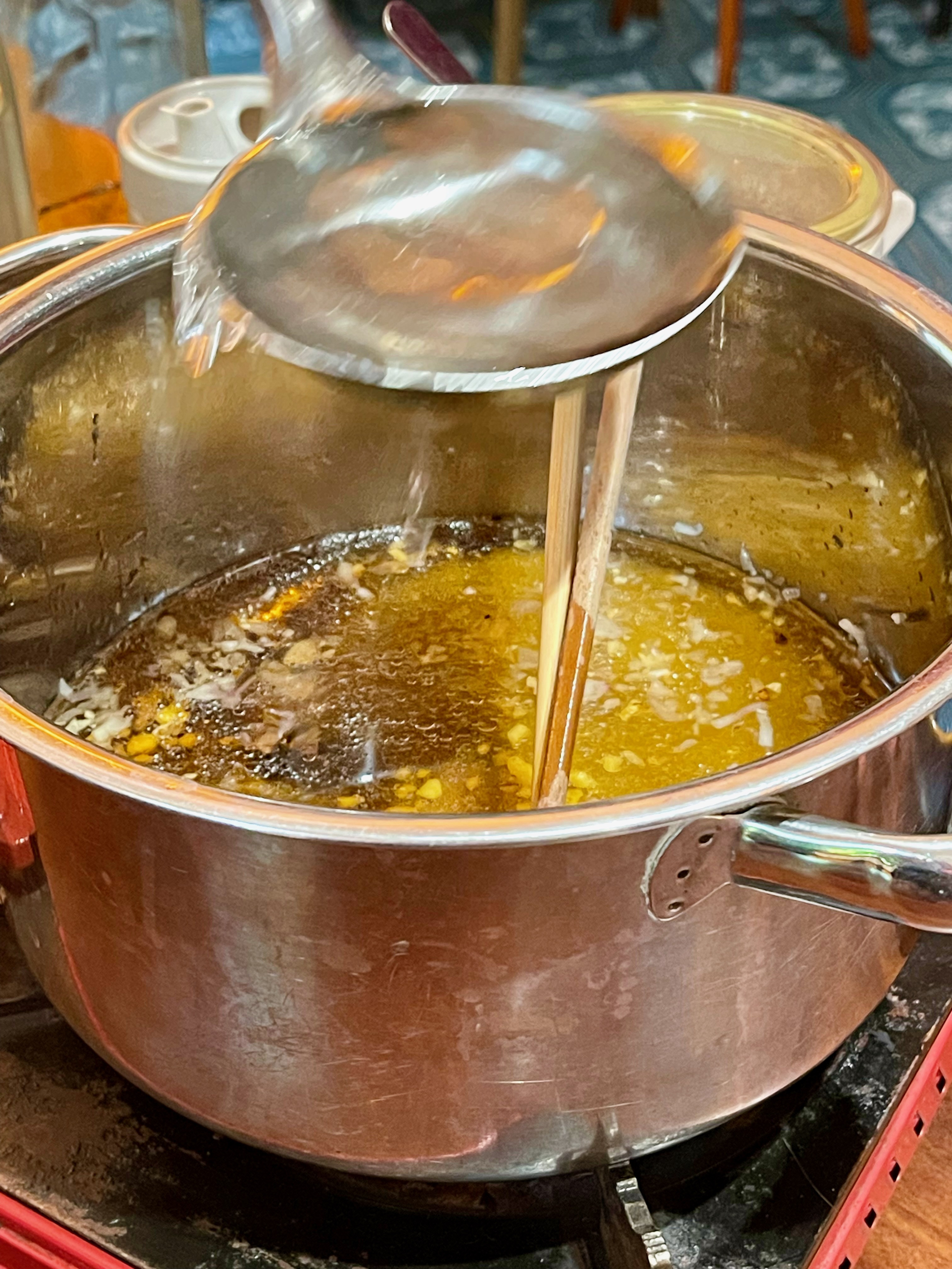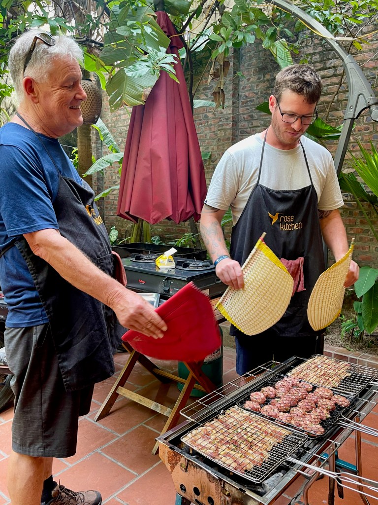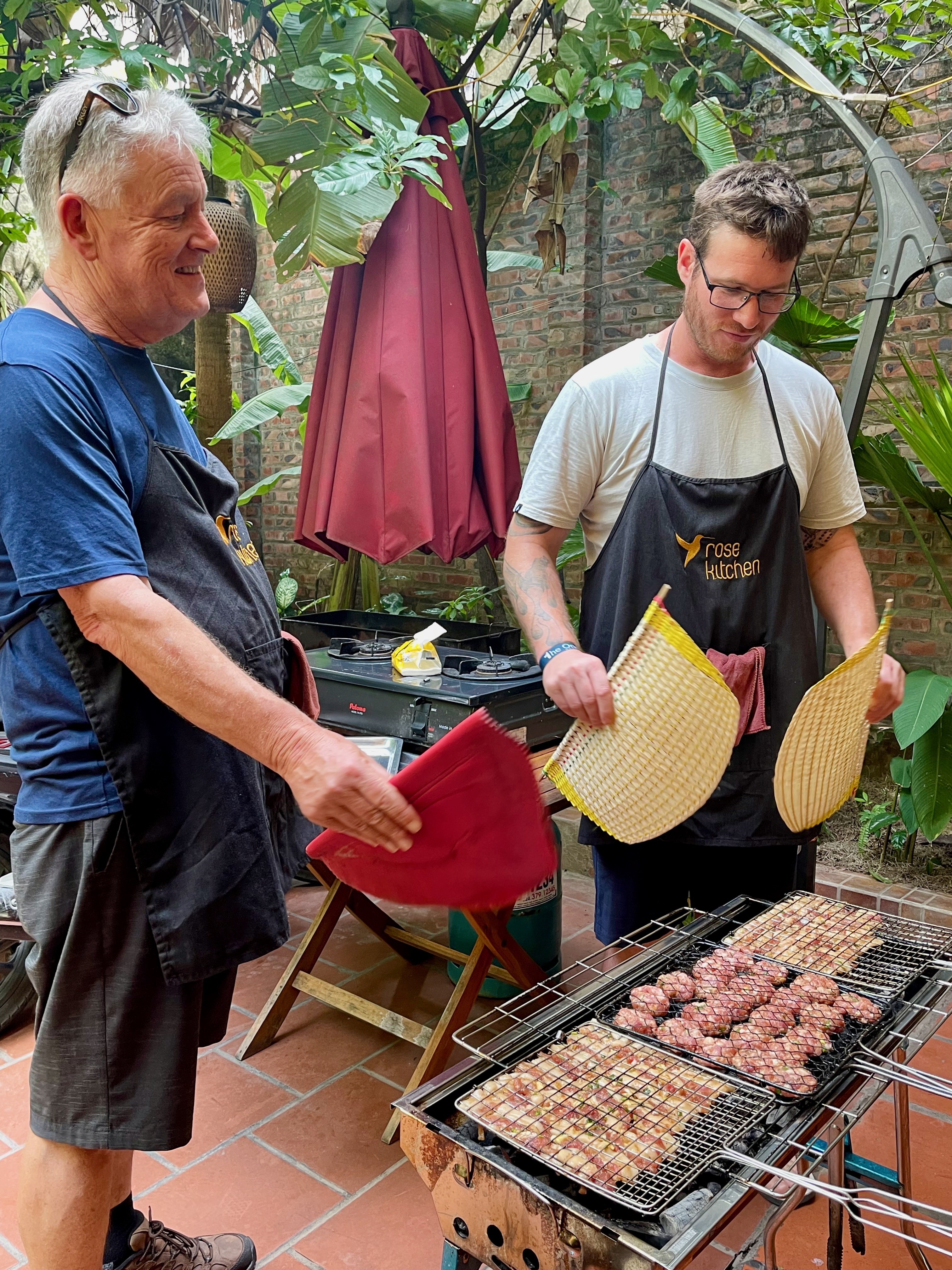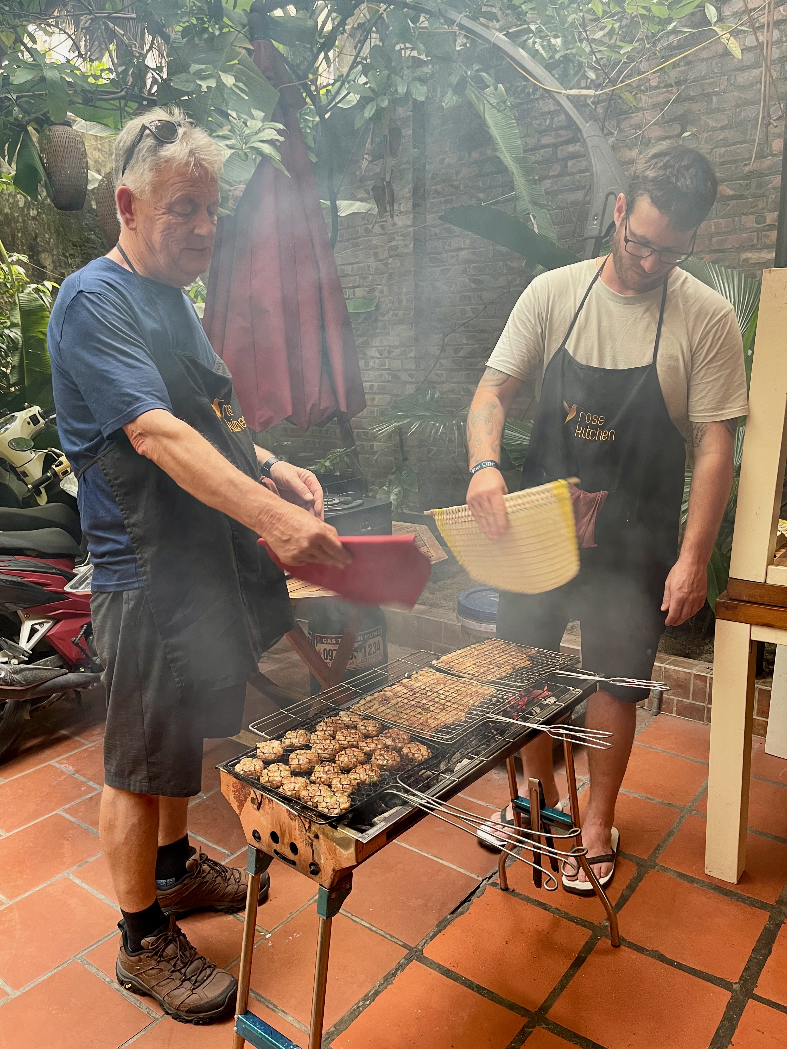 Next up we prepare the spring rolls and put them aside for frying before moving onto the pork which will be barbecued outside. Finally we make the broth for the bun cha.