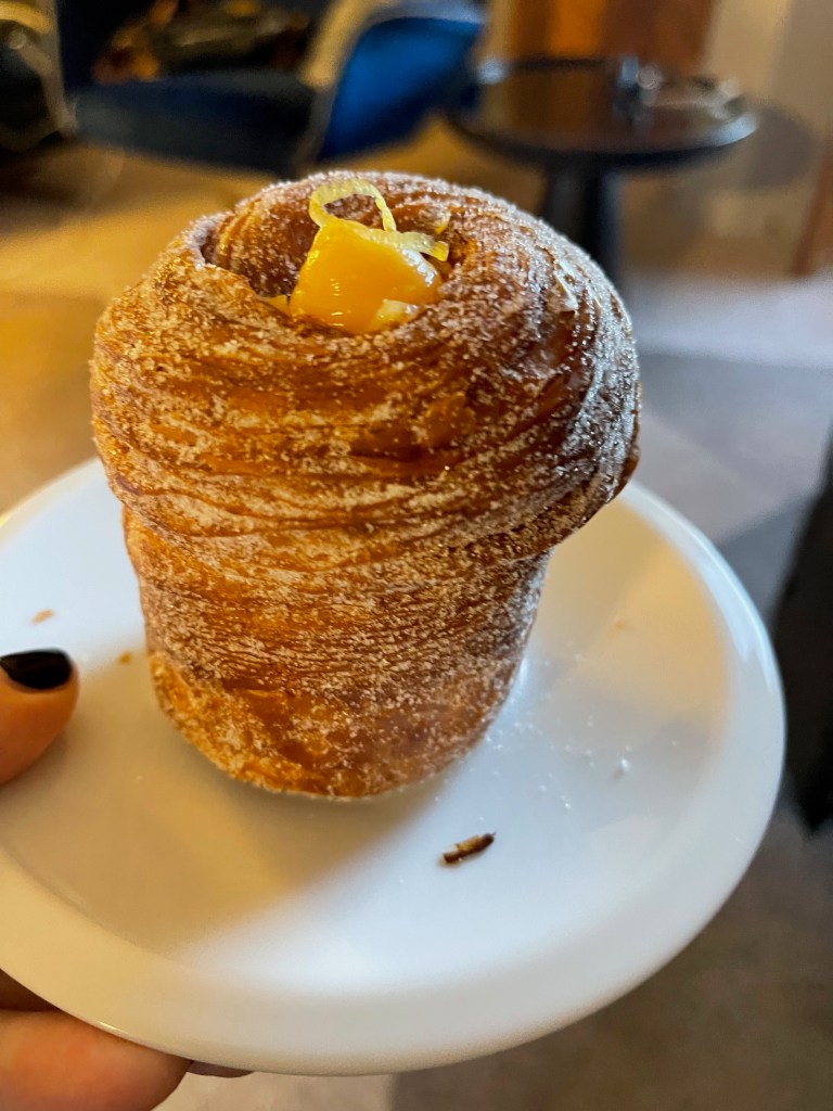 Even though he was there 30 minutes before the shop opened they were sold out of traditional croissants, but the lemon curd cruffin and han and cheese croissant he brought back to our hotel room were very good.