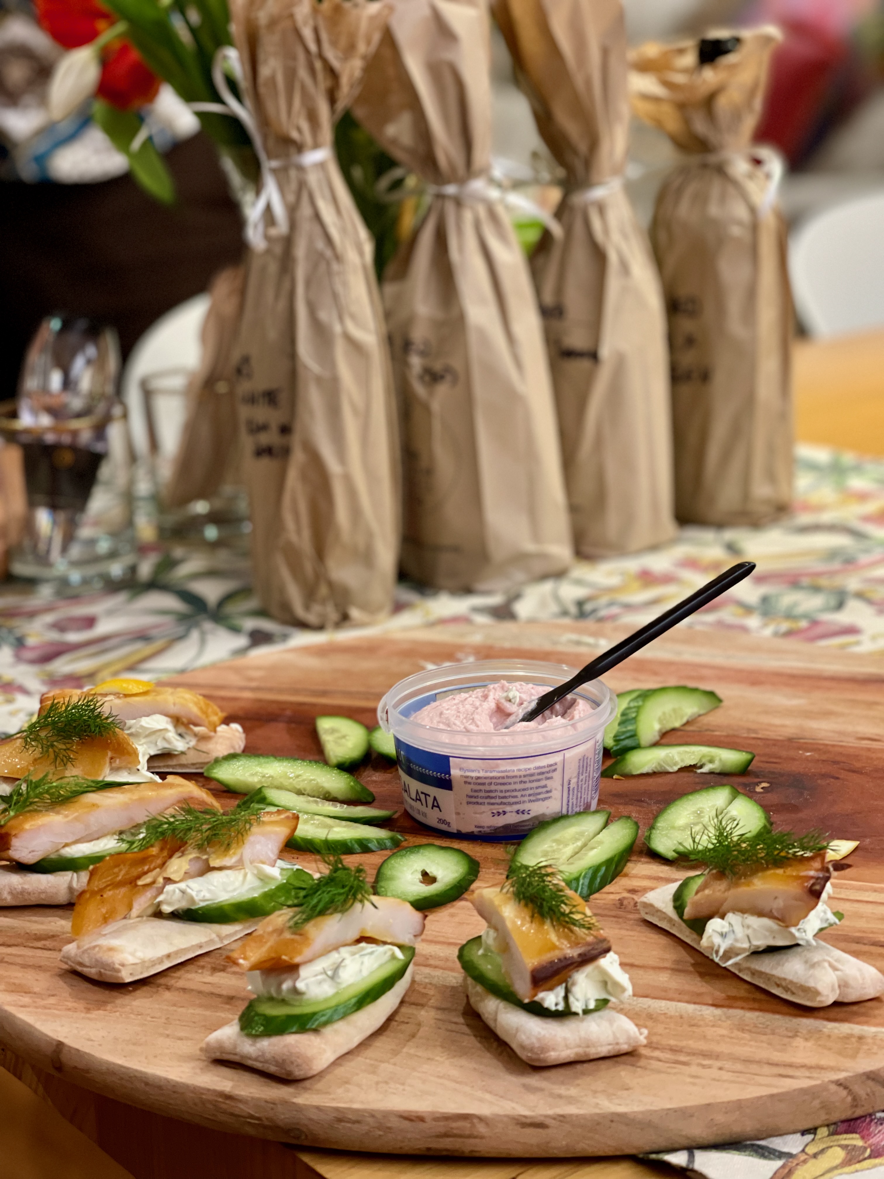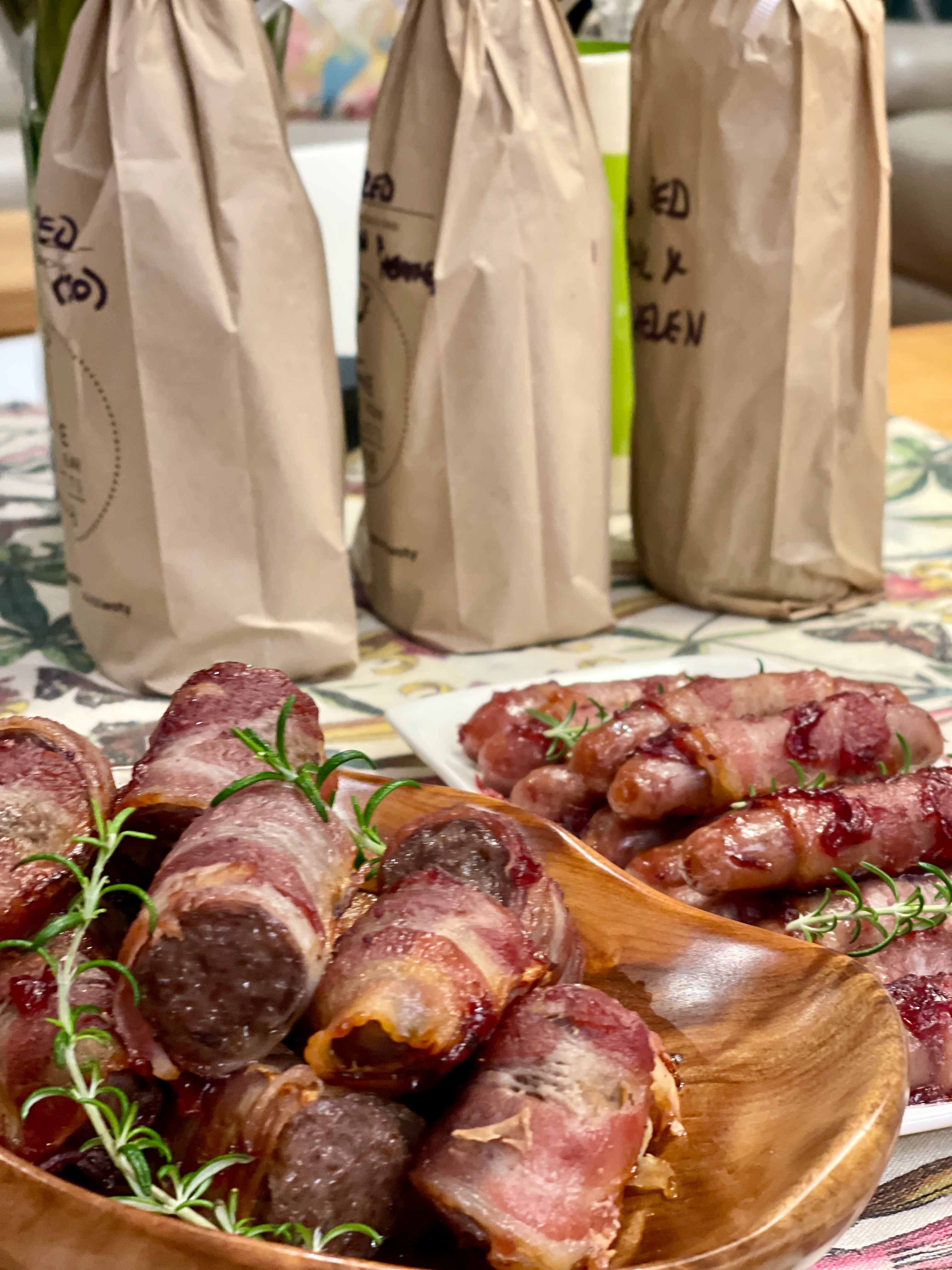 The idea was simple: every couple (plus me) was responsible for providing wine and a matching small course of food—sufficient for all 11 guests (I was the odd one out). The wine was presented “blind,” i.e., in brown paper bags, and the rest of the guests had to try and guess what it was.