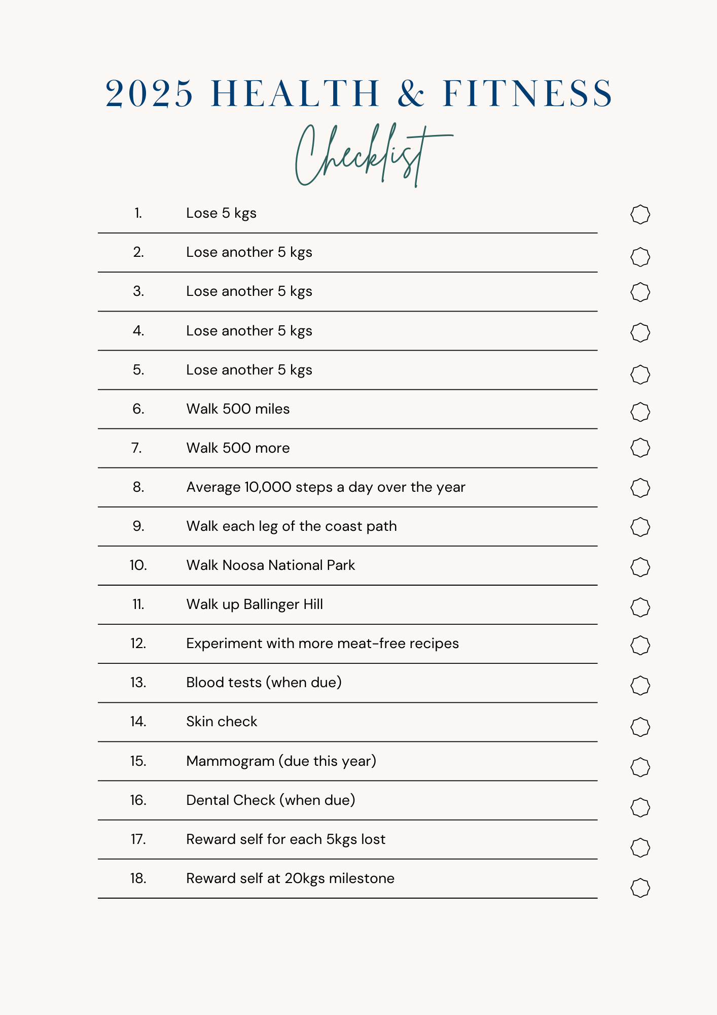 But what about goals heading into 2025? I’m happy with the ones I set last year. The way I figure it, I poured the foundations for this year, last year – so this year is about building on that. Does that make sense? Therefore, I am treating this year like a to-do list. My health and fitness checklist mixes mini-goals and milestones with more adulting tasks—the things I forget unless they’re written down. It makes it all feel more project-y.