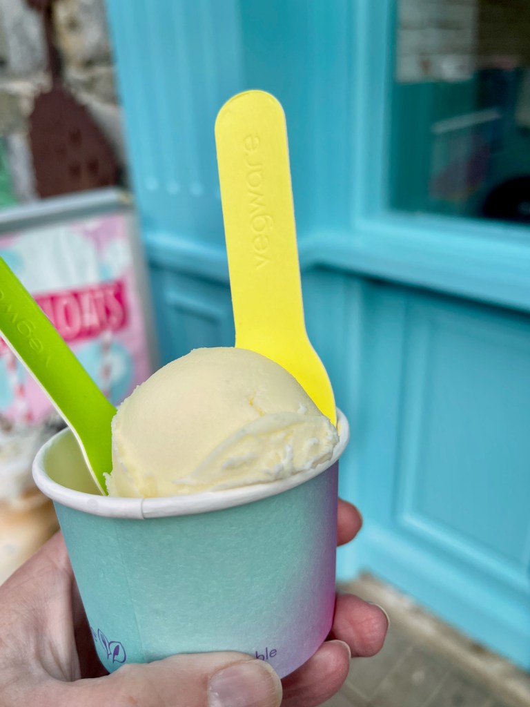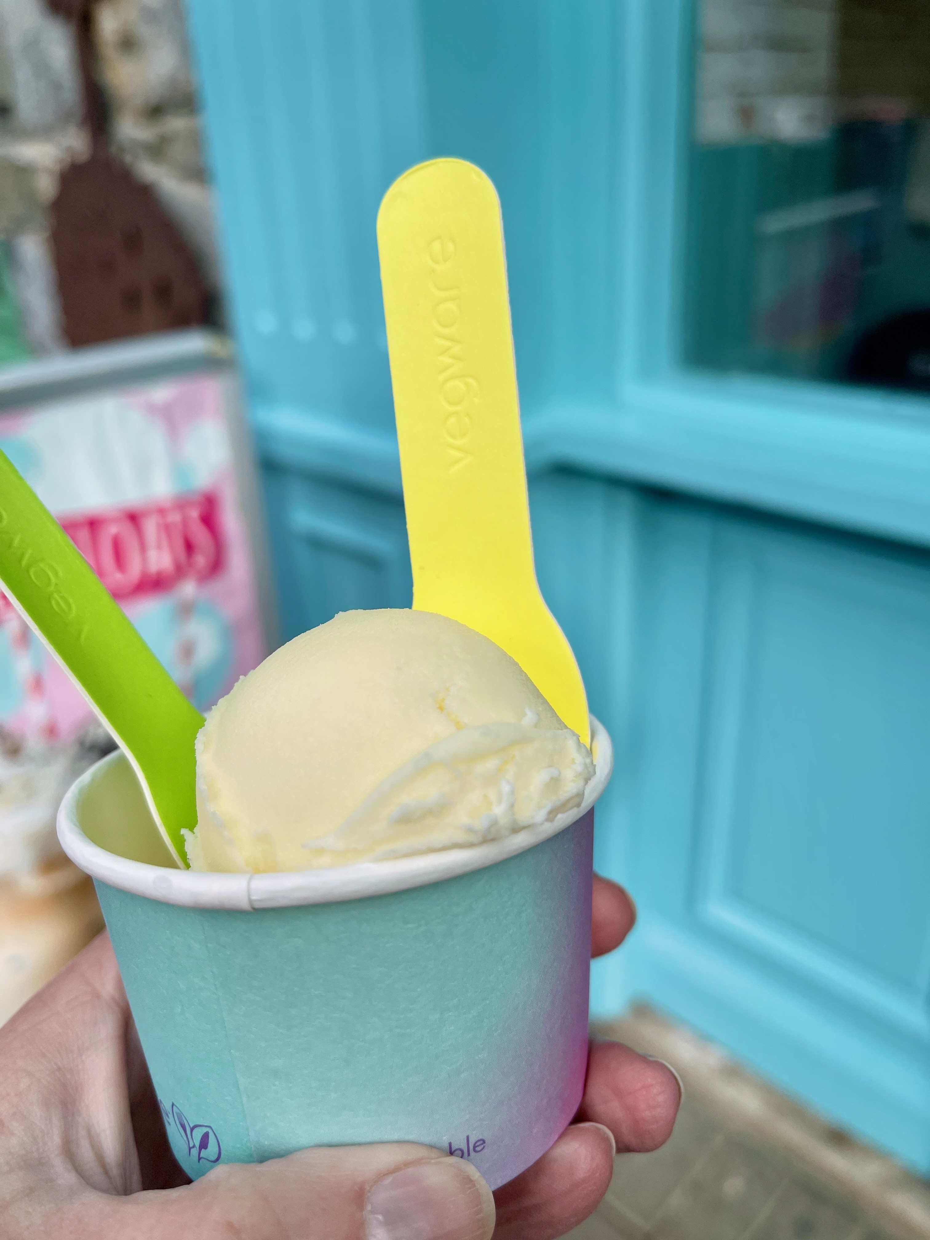 In St Ives, we split a pasty, in Wimborne, a sausage roll, in Pitlochry a Scotch pie and in Exton, the baker cut a pippin in half for us and we took turns to have the top or bottom of a scone. We shared an ice cream in pretty much every region we visited – sometimes a scoop in a cup, sometimes a single serve tub.