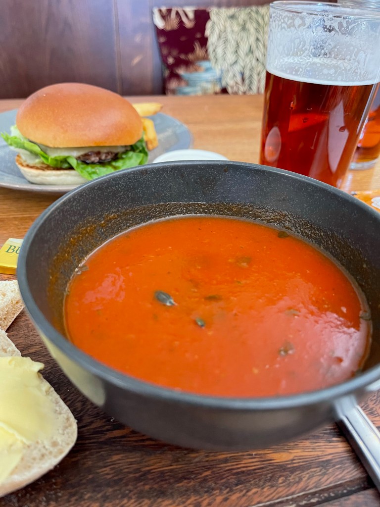 Lunch was at the Countryman’s Inn in East Knighton. Grant had the lunch special – a burger, chips and a beer for £12. I opted for the tomato and basil soup.