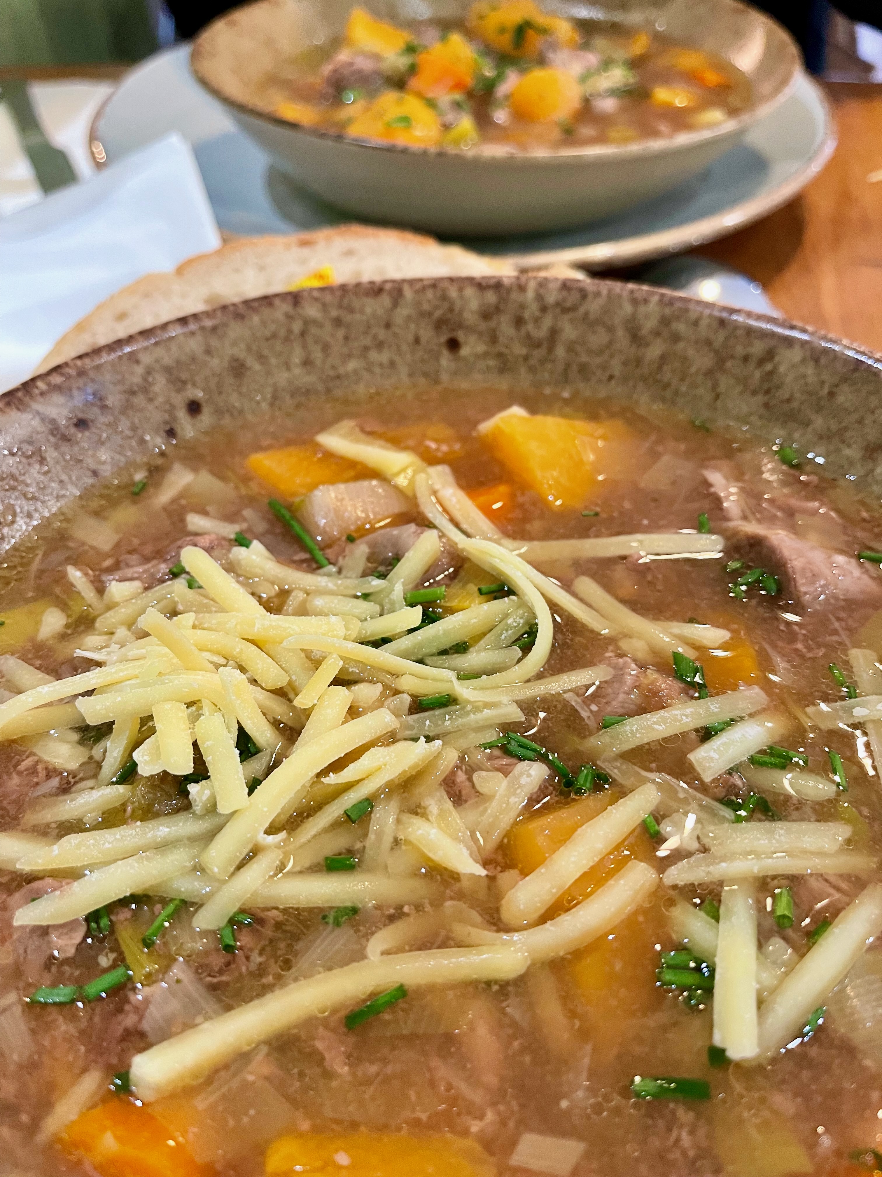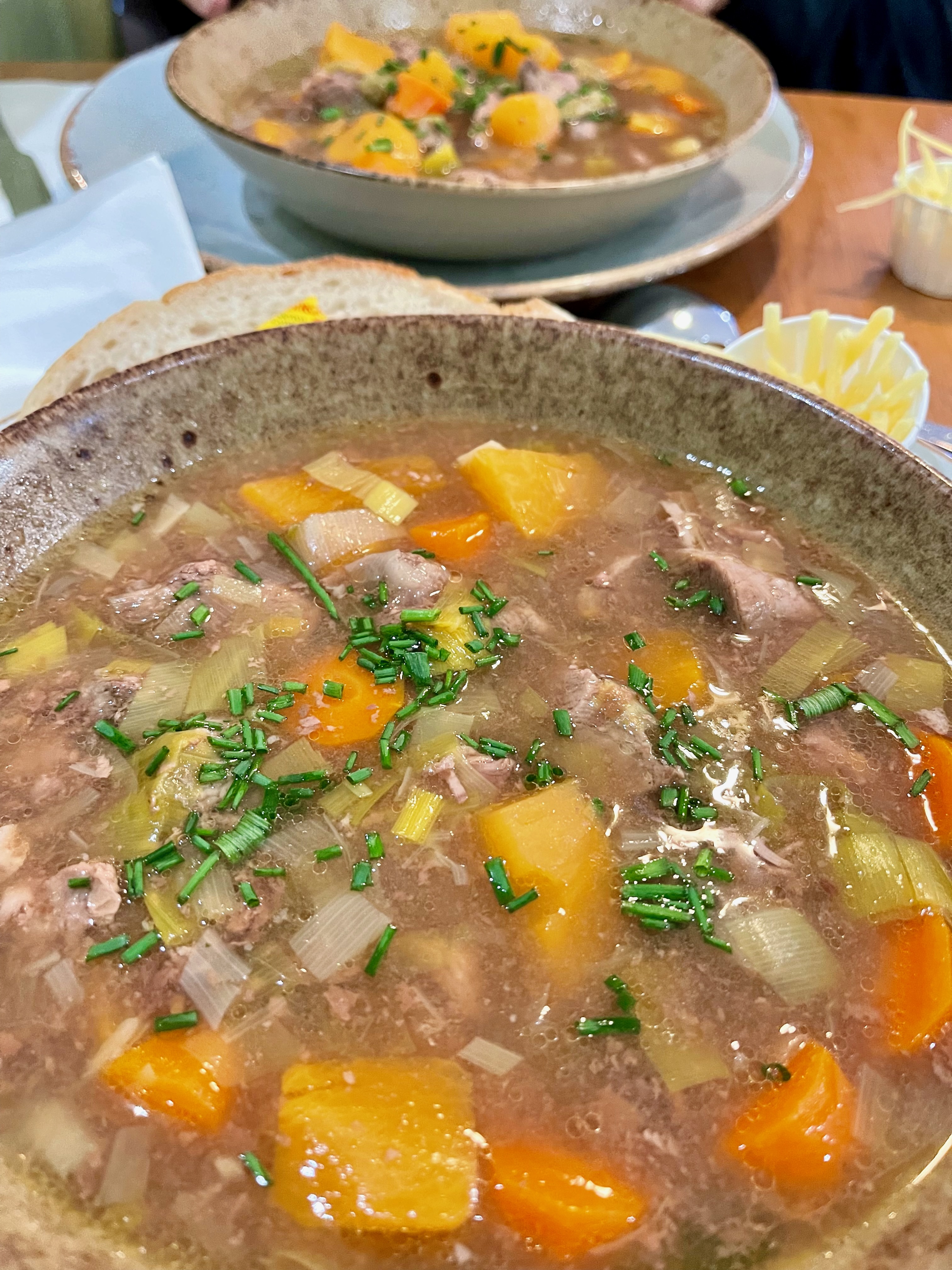 Other than the cheese shop, Taffs Wells doesn’t have a lot to offer on this cold, grey, threatening-to-drizzle Friday so we head for a pub in Morganstown (equally as uninspirational) to find some lunch…and the pub is full. We recall seeing a Garden Centre down the road, so head there instead and have our first bowl of Welsh Cawl. Cawl was, I decided, invented for cold, grey, drizzly Fridays… in fact, any cold, grey, threatening-to-drizzle day.