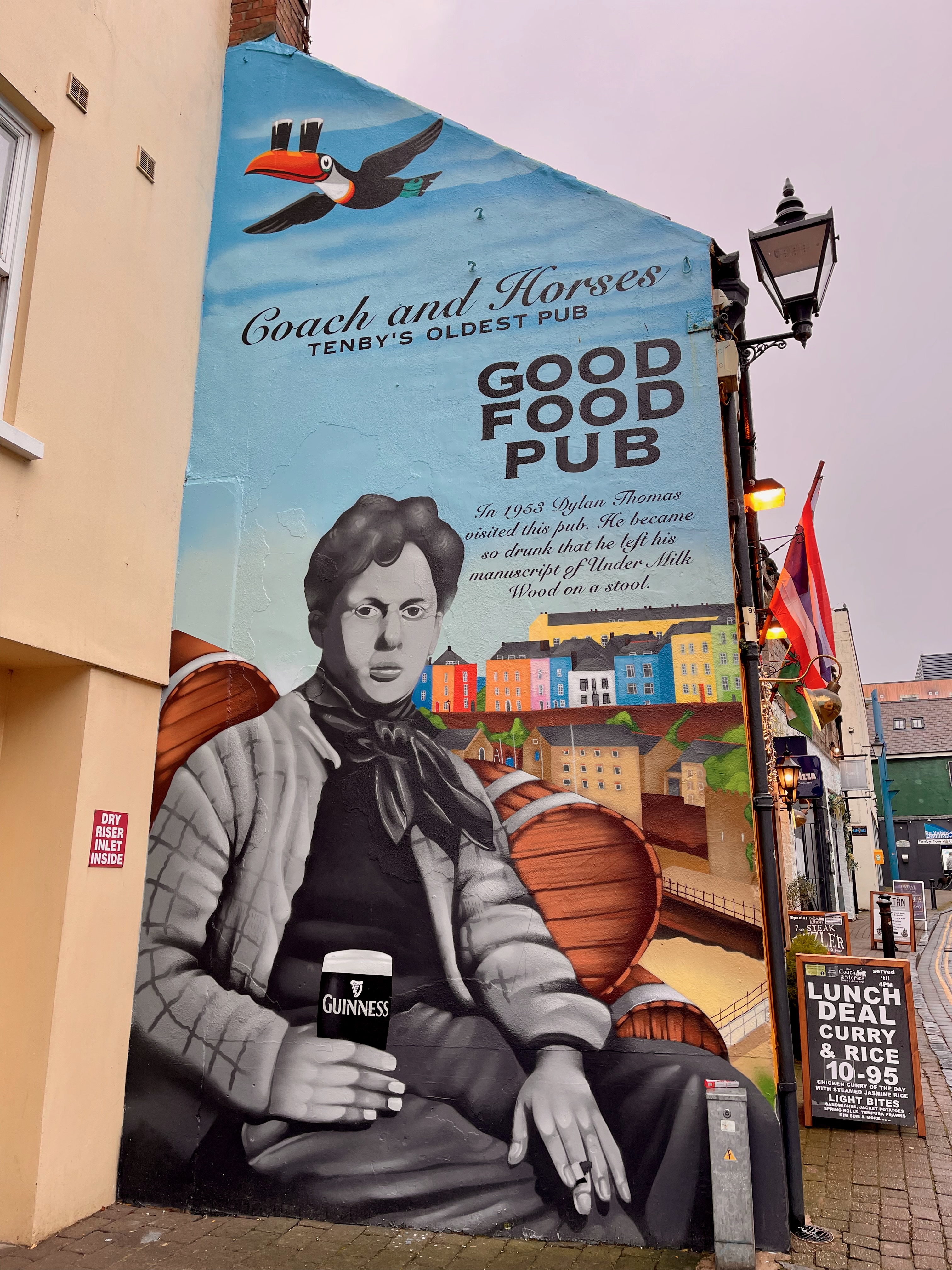 We head into town for a walk, stopping at Tenby’s oldest pub (dating back to the 1600s), the Coach and Horses, for a beer. This pub’s claim to fame is that Dylan Thomas once got so drunk in here (from all accounts, there was nothing terribly unusual in that) that he left his manuscript – the only copy of the play’s manuscript – Under Milk Wood, on a seat in the bar.