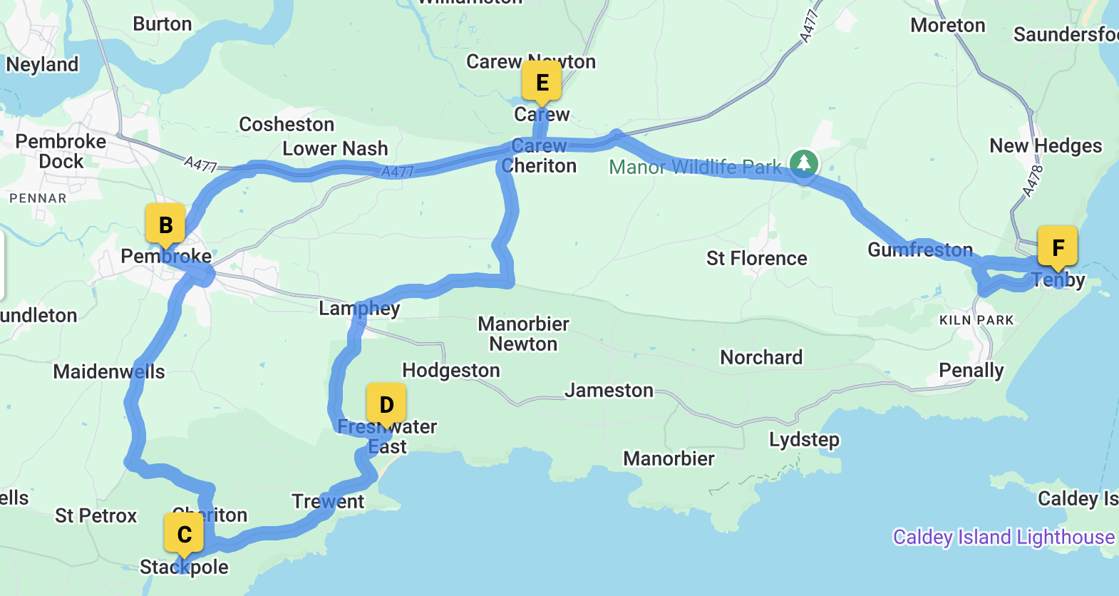 Managed to get the last table for lunch at Carew Inn, so with an hour or so to fill in, went for a drive – down to Pembroke, past the castle and then to Stackpole and along the coast.