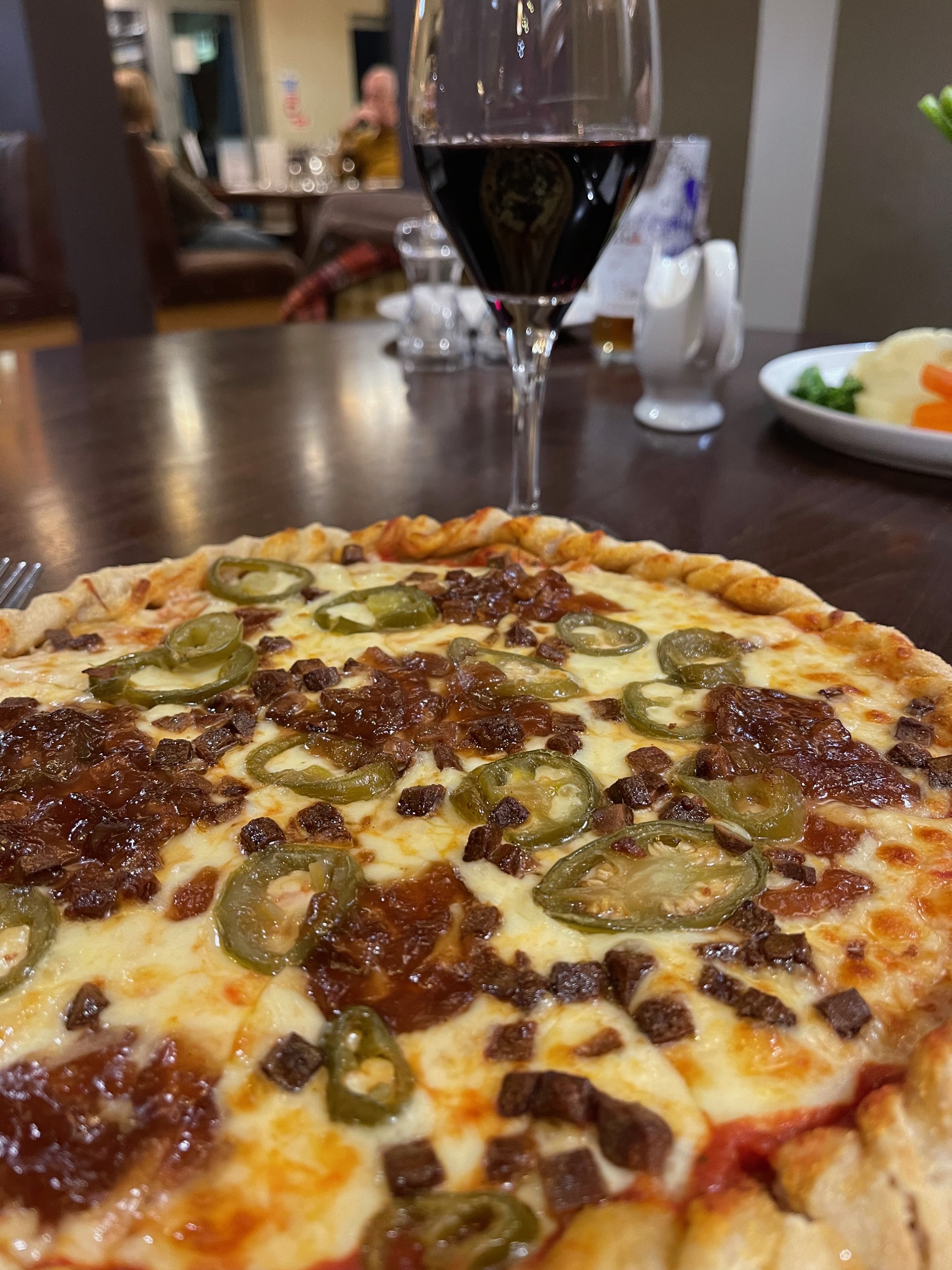 Dinner tonight was back at the Waterloo. While Grant had the same thing he had last night (why mess with a good thing), I had a pizza – chilli beef, mozzarella, red onions and jalapenos. It was a good choice.