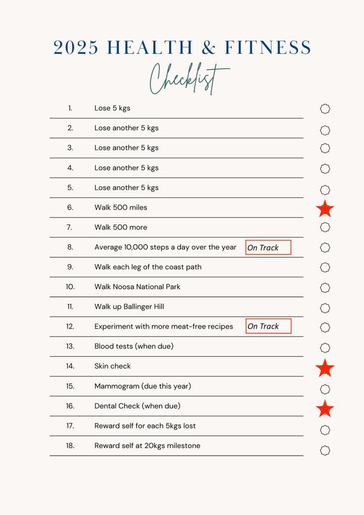 Jo I would say you have had a huge win! To come home from the UK with no extra kilos is quite amazing. I do remember how much walking you did while there so well done. Mid year is exactly the right time for you to reassess and march forward. I notice you have Noosa National Park on your checklist. I have promised myself to do that, very slowly with my dodgy knee, next time we are up there. Have a great month ahead.