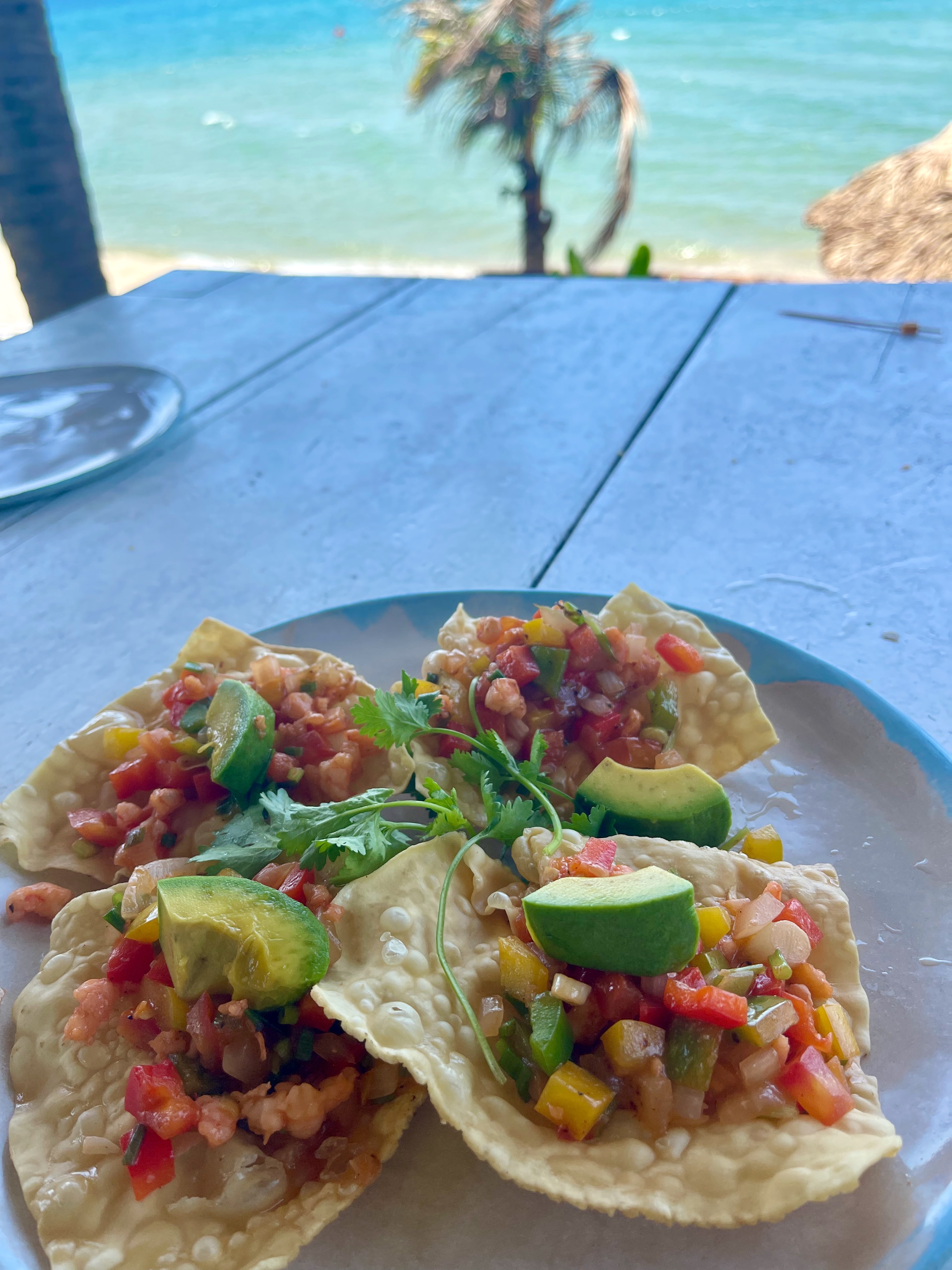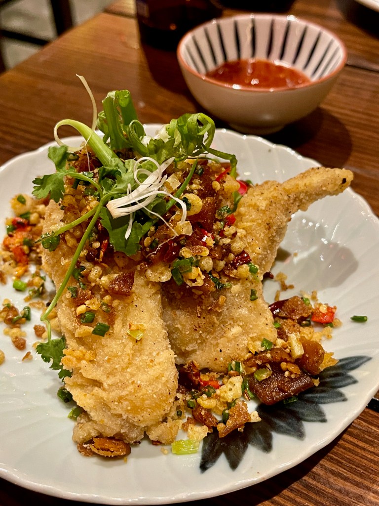 Hoi An Wontons are deep-fried wonton wrappers topped with a salsa-like topping of vegetables and sweet and sour shrimp. They’re perfect with a beer.