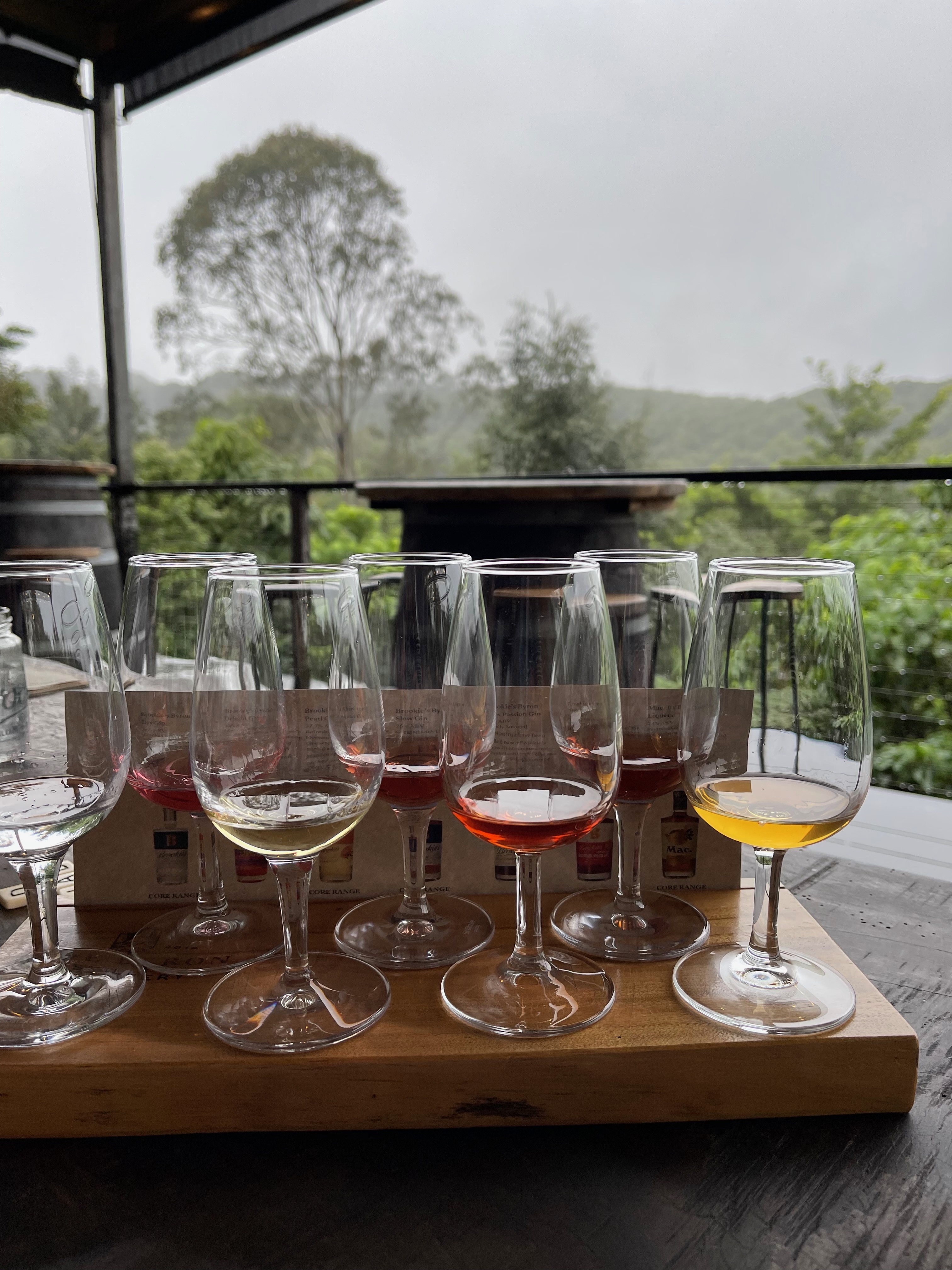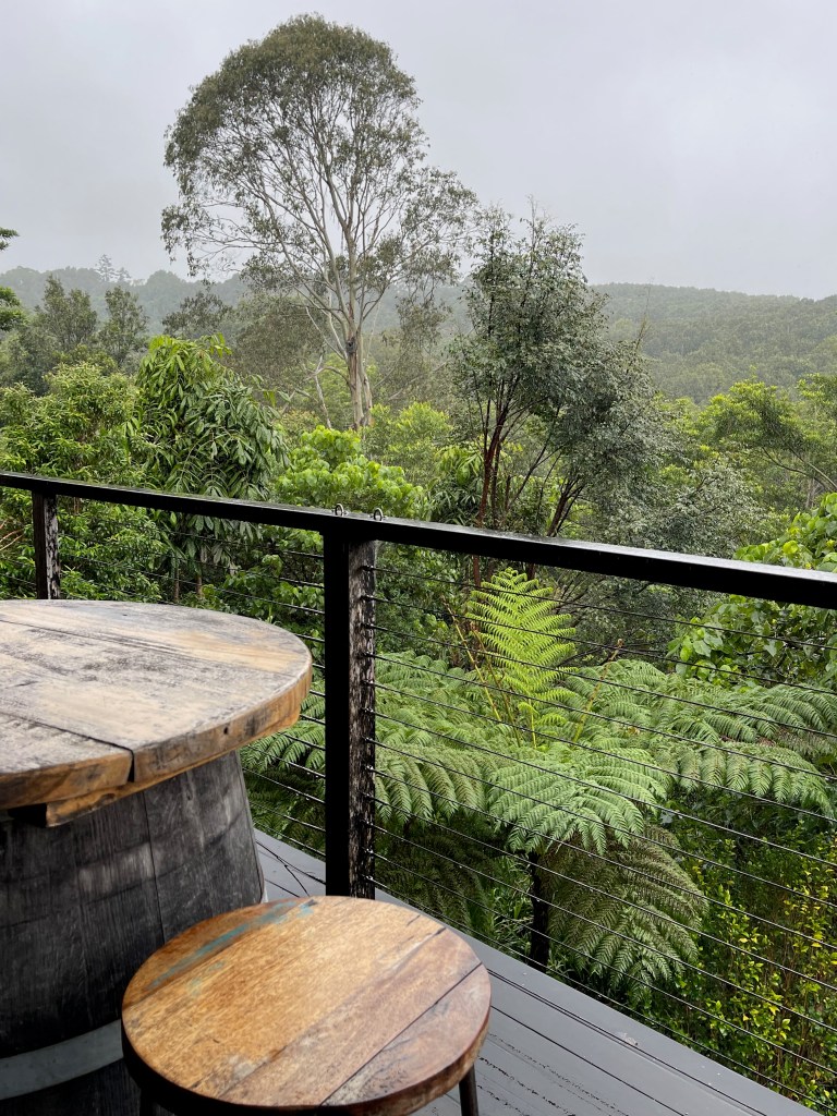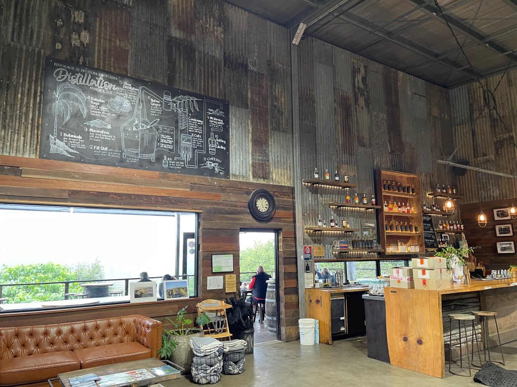 Cape Byron Distillery is in a lovely rainforest setting on the road out towards Bangalow, and today, with the rain softly falling, was quite magical. Or was that the gin? Sarah said when she was last there, one of the resident koalas was in a tree just off the deck. Sadly, he didn’t come to visit today.