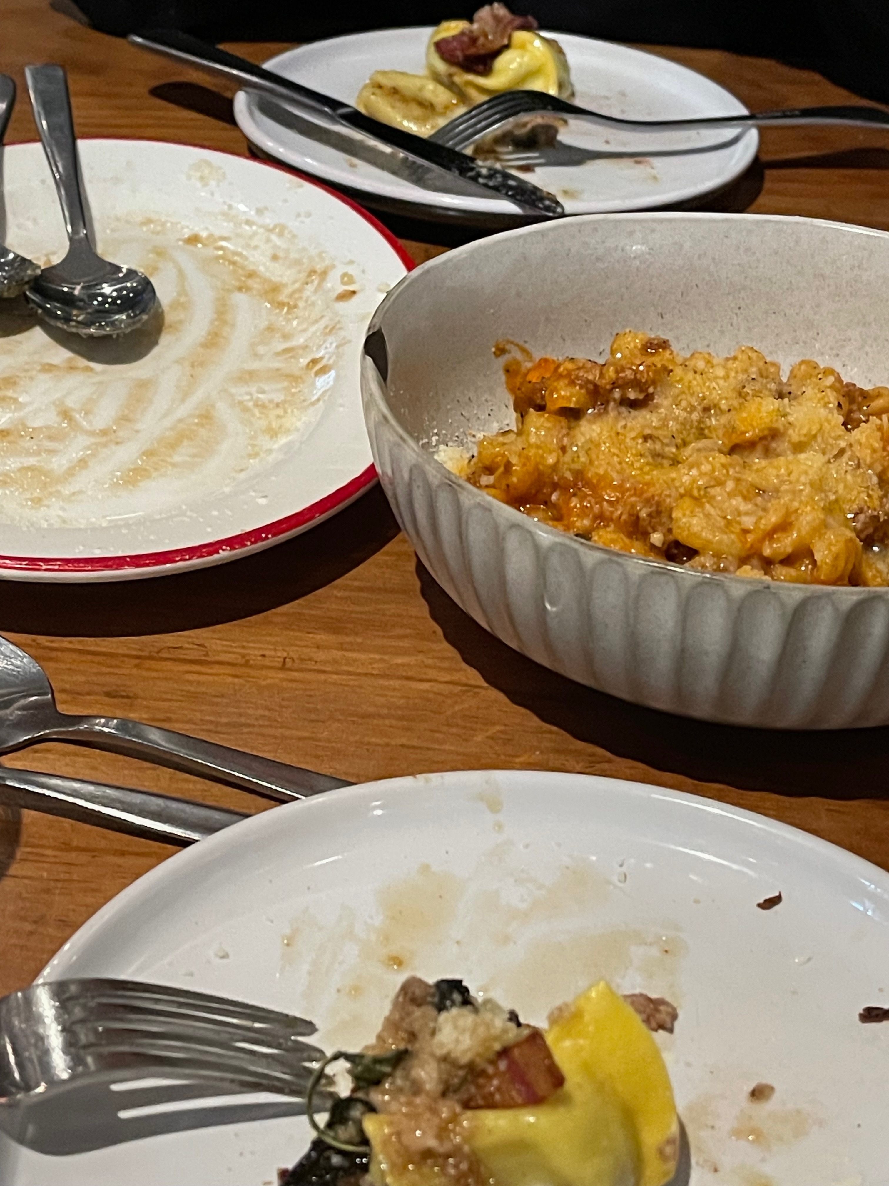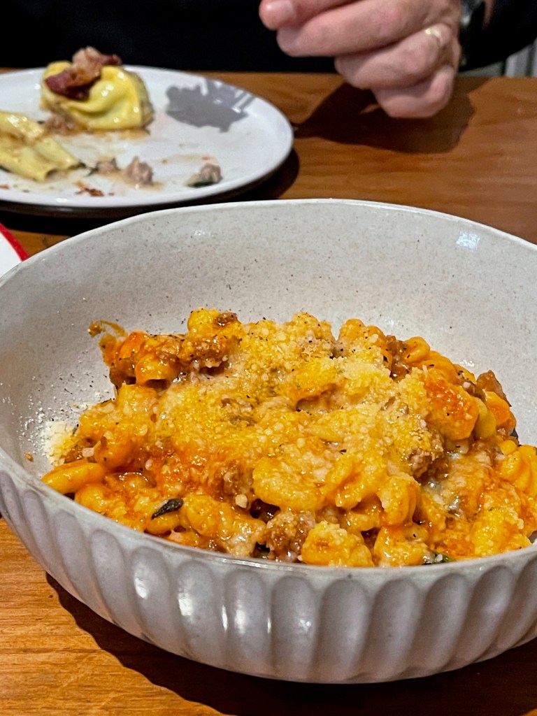 We began with (excellent) focaccia, house-made whipped ricotta, and some pickled local vegetables. To follow, we shared two pasta dishes between the three of us – and they were two of the best pastas we’d ever eaten. As Sarah said, ten out of ten, no notes. Sadly the lighting was crap, so my photos are too. Trust me when I say it all tasted much better than it looked.
