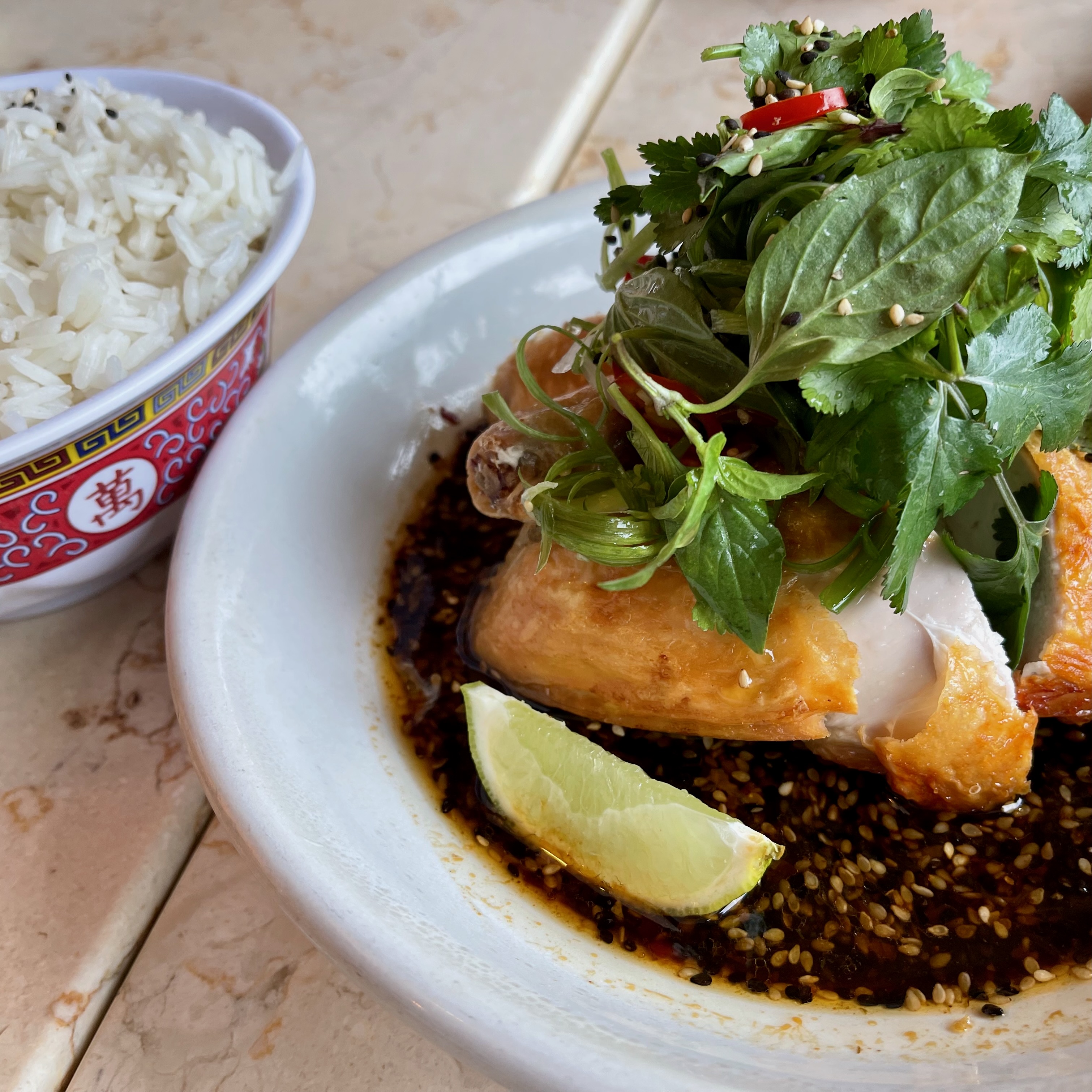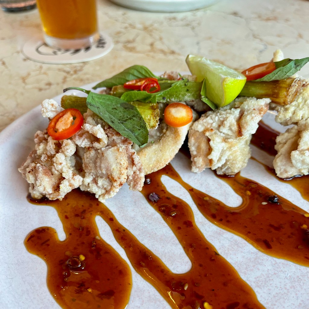 We shared the smashed cucumber with wood-ear mushrooms (Grant’s dish of the day and a close second for Sarah and I), the miso-butter corn ribs (my dish of the day), some fried chicken with a spicy tamarindy firecracker sauce, and Shandong Chicken (Sarah’s dish of the day).