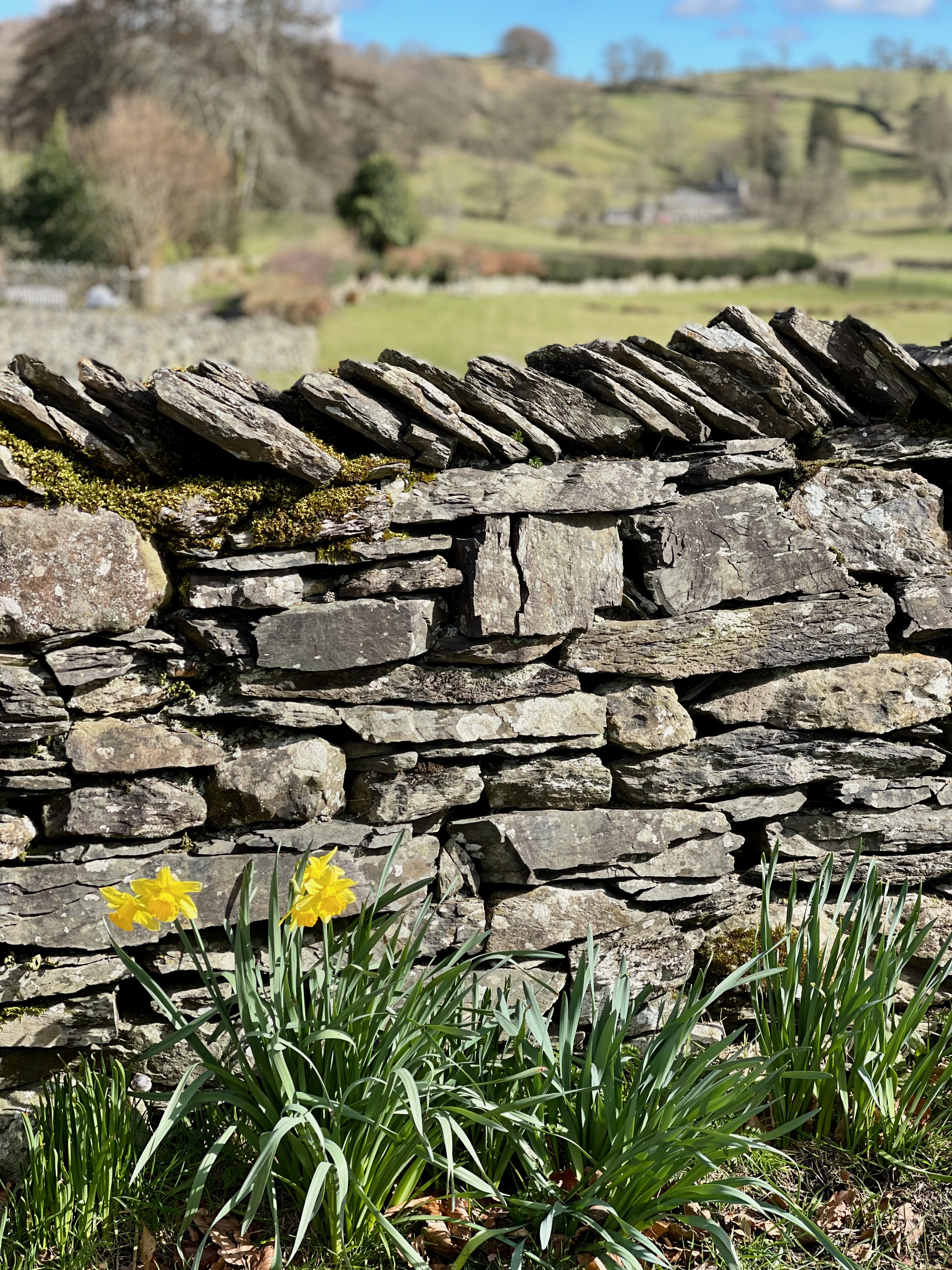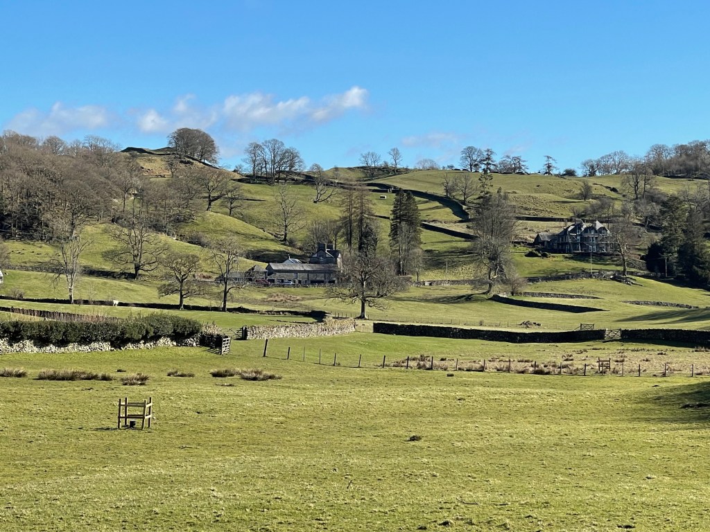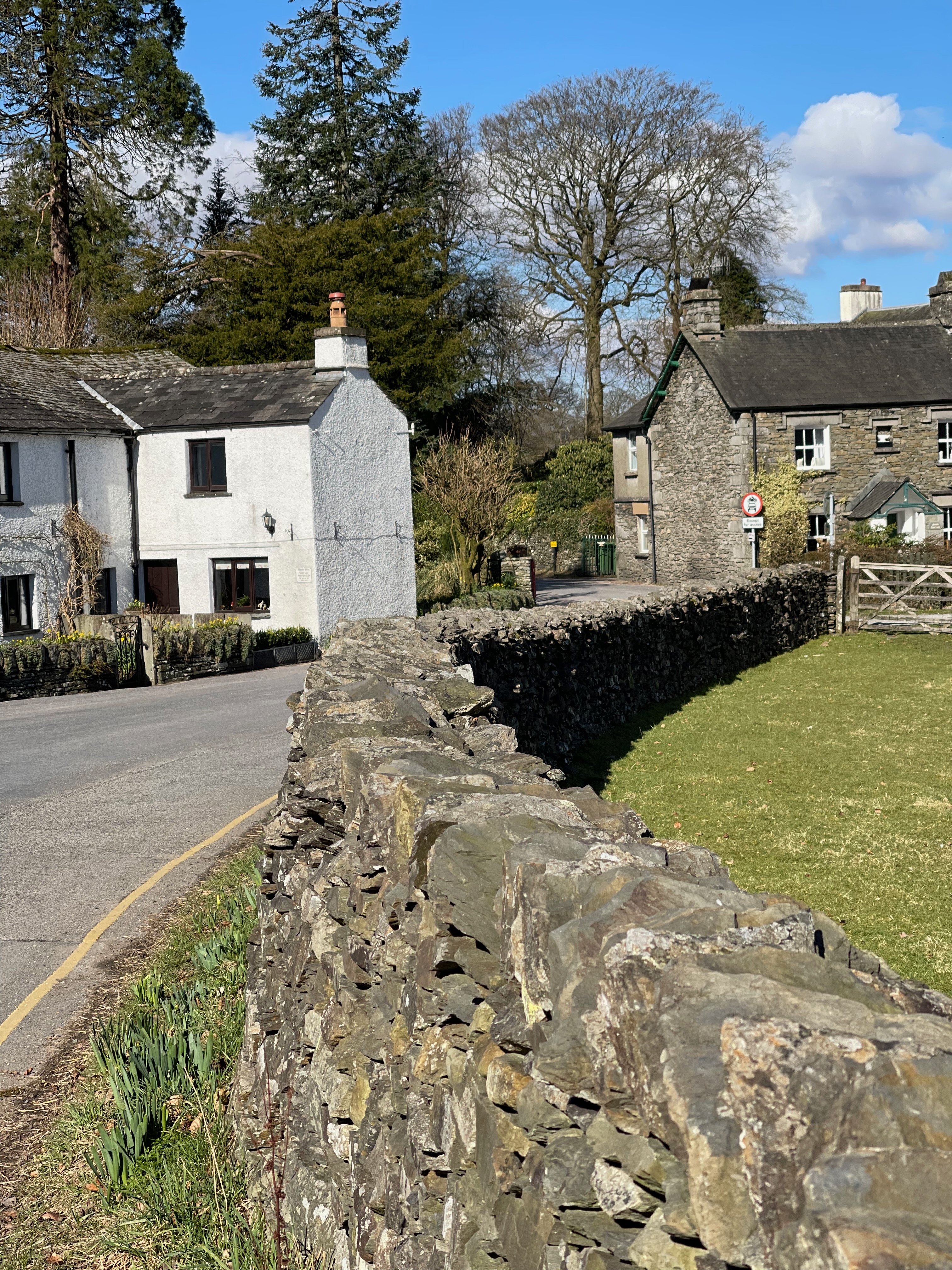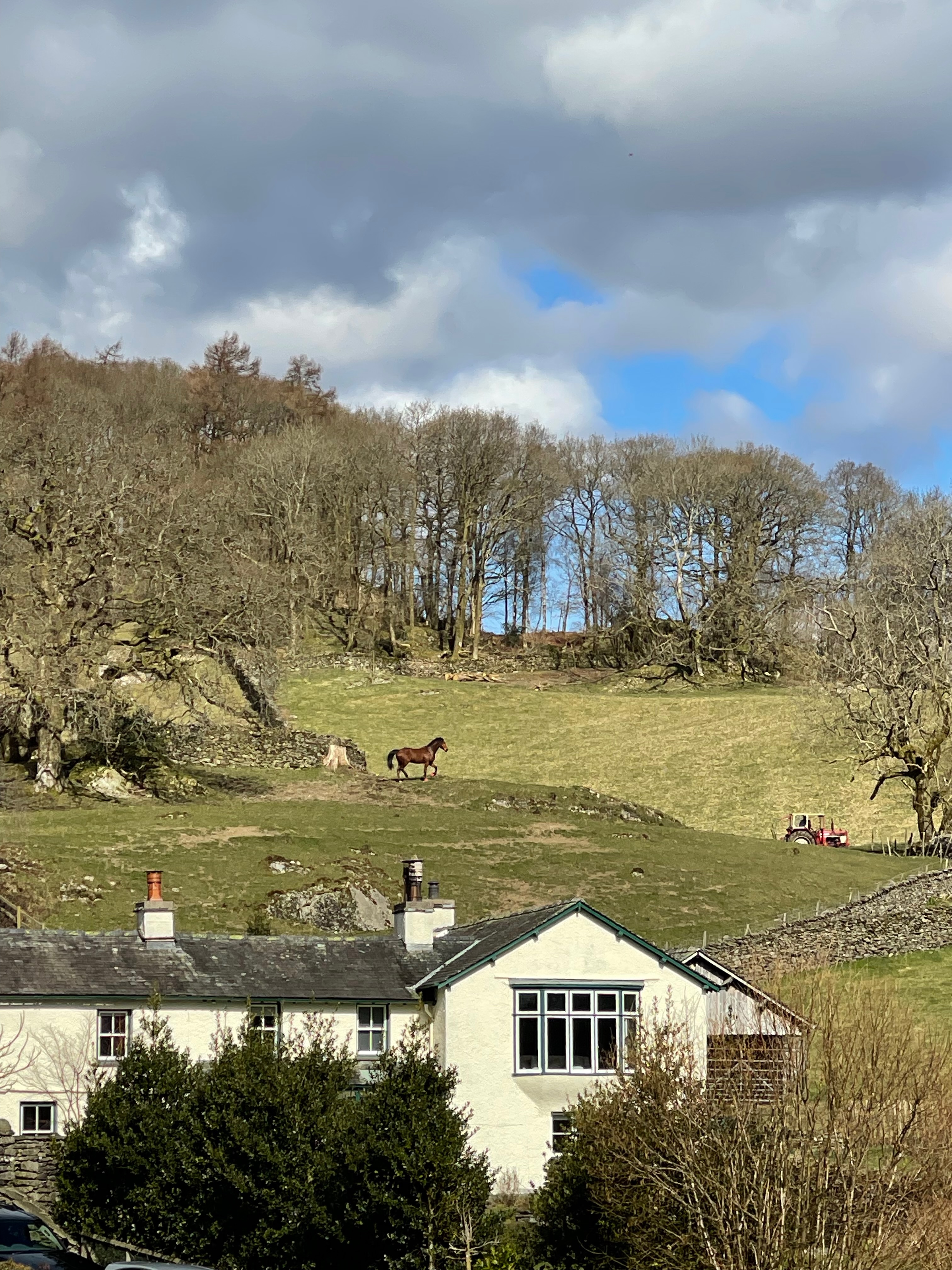 The house she lived in with her husband can be seen from Hilltop, and as we looked across at it, a pair of horses on the hill behind began running and playing in the sunshine. Spring fever, perhaps.
