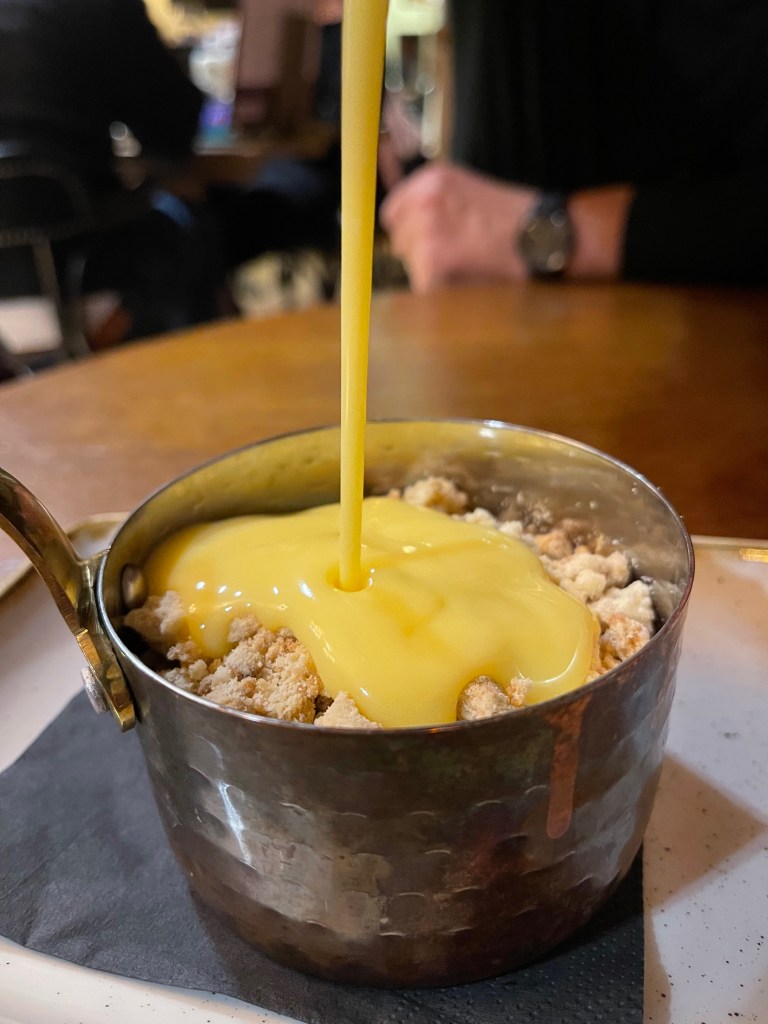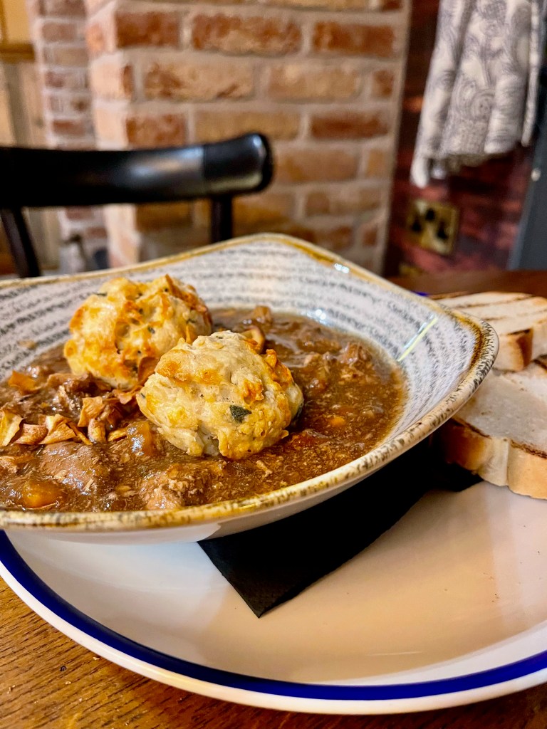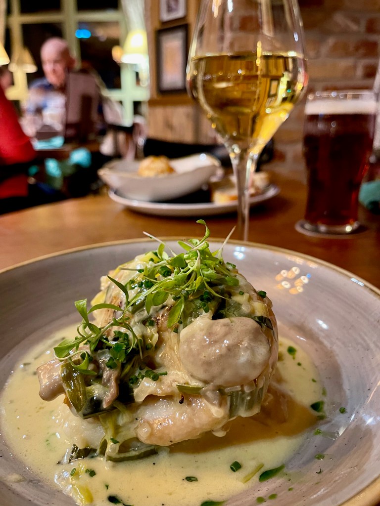 It was a fabulous meal. To start, I had Thai fishcakes (still craving the spice we didn’t get last night), and Grant had potato and leek soup. For main, I had chicken breast with creamed leeks, mash and mushrooms. Fanflippingtastic. Grant had a Lancashire stew with dumplings. We shared a cinnamon and apple crumble to finish, and were glad of the walk back to the cottage.