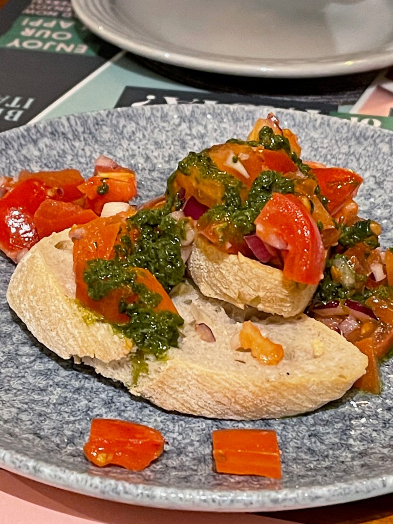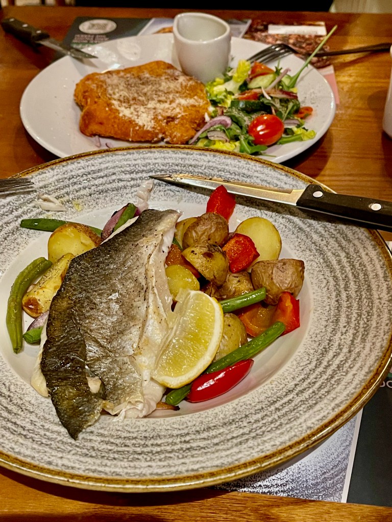 We’re craving something fresh for dinner, but don’t want to spend a fortune, so we end up at Bella Italia. We shared a bruschetta, and to follow, I had the sea bass with new potatoes, peppers, and beans, and Grant had Chicken Milanese with salad.