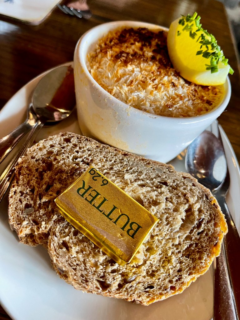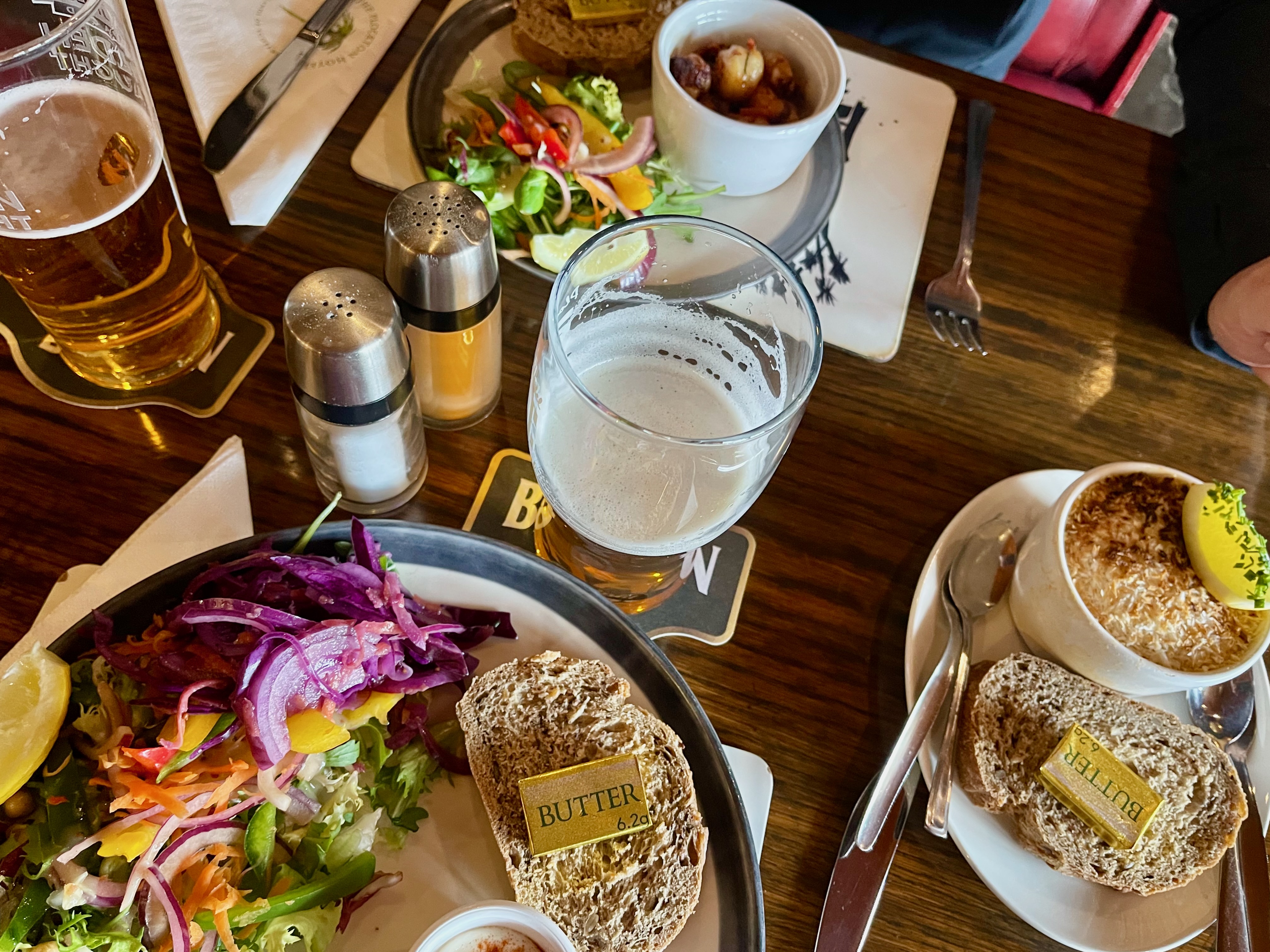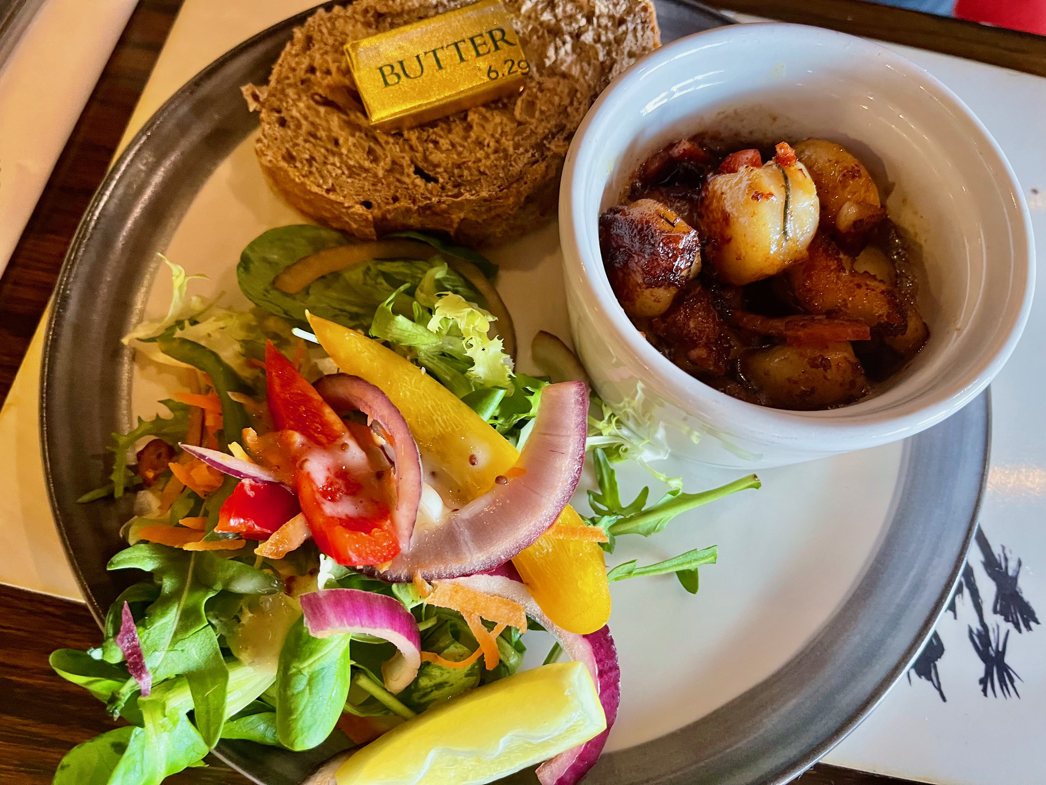 Because it’s out of season (a familiar story), there’s not much open in town, so we head to the pub where we’re dismayed to hear that they have no prawns in… yet, but there might be for dinner. We shrug and sigh and order (to share) a dressed crab, queen scallops with garlicky, bacony butter, and the Plockton smokie – smoked mackerel, tomatoes, cheese and cream baked in a little pot with a crispy topping. It sounds a tad dodgy, but served with a fantastic salad and excellent bread, it was gorgeous.