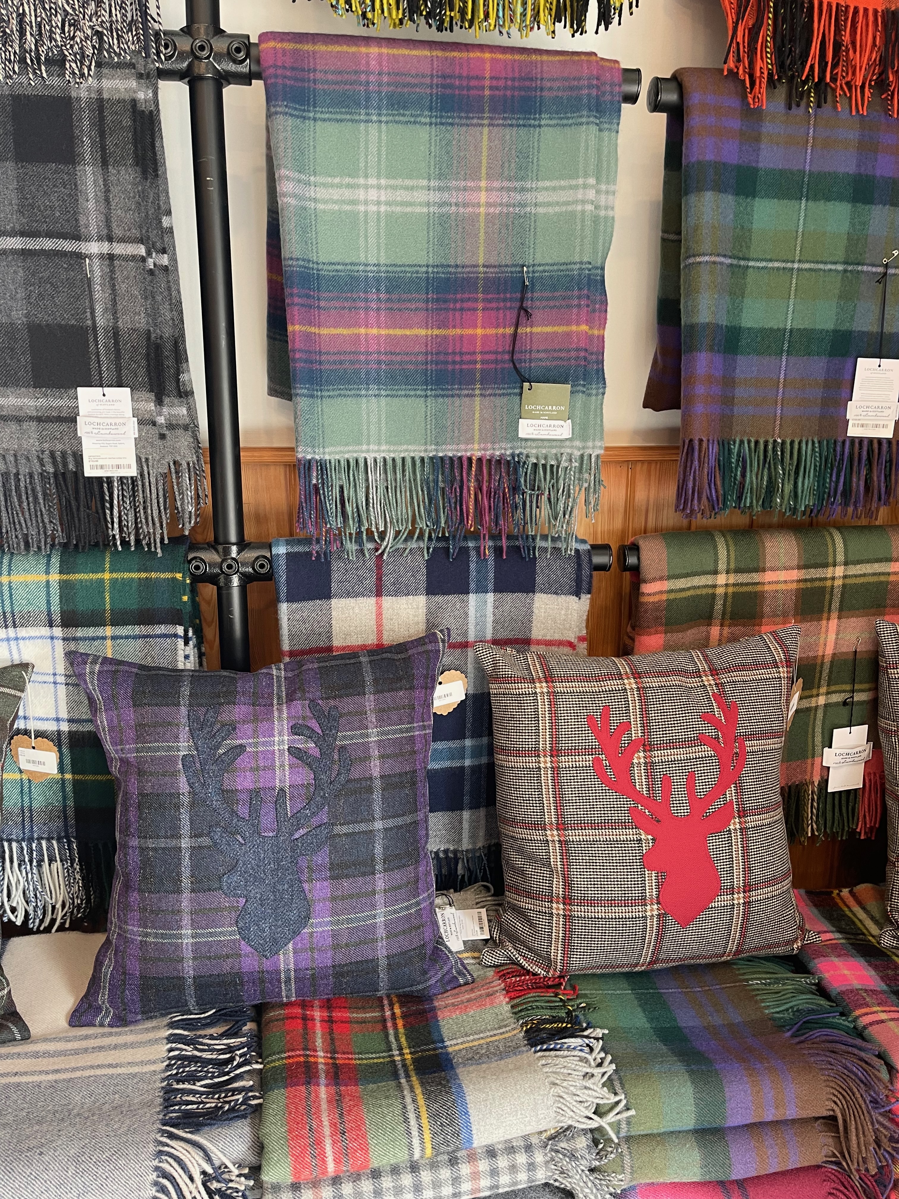 On our way back to Inverness, we stopped at Lochcarron of Scotland at Strathcarron. Try saying that three times after a few drams. It has so many fantastic tartans and I buy myself a poncho. It’s unavailable in the Hamilton tartan, so I opt for the Hame tartan. Designed by Lochcarron, its tones were inspired by heather, gorse, and the waters of the rivers and lochs. Whatever the inspiration, I love it.