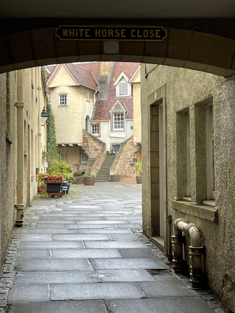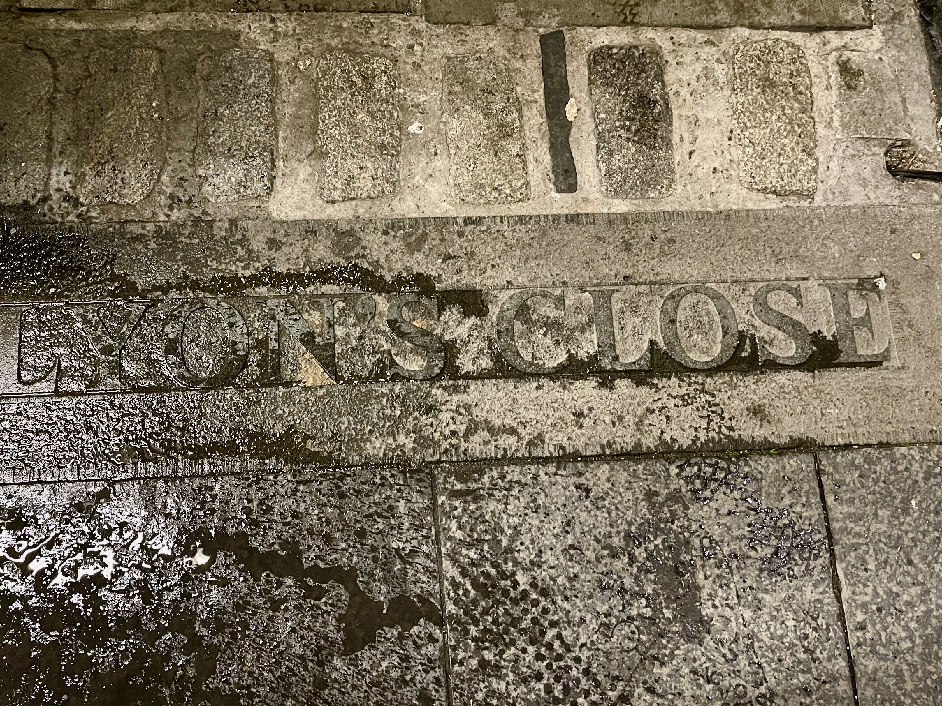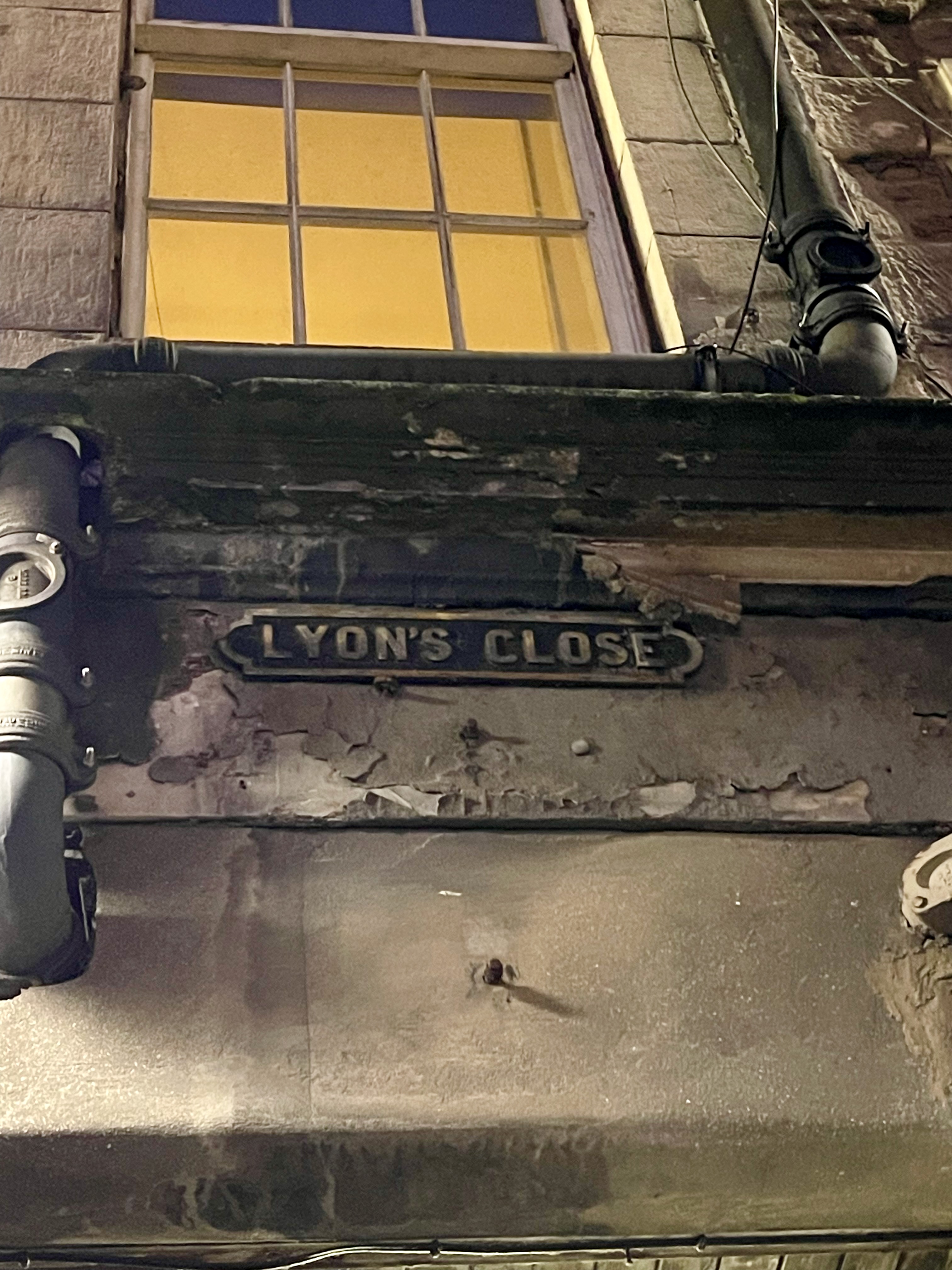 Outside, it was cold, and a damp mist was settling, but we walked back up the Mile to see the close that Sharon and I decided had been named after our family – Lyon’s Close. These narrow alleys are usually named after prominent people, families or occupations, and date back to the 16th century, but I haven’t been able to find out any more information about it, or why it was also once known as Stalker’s Close too.