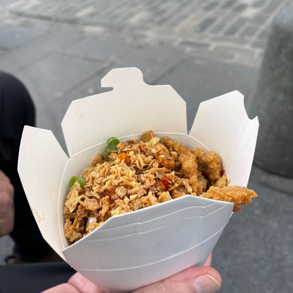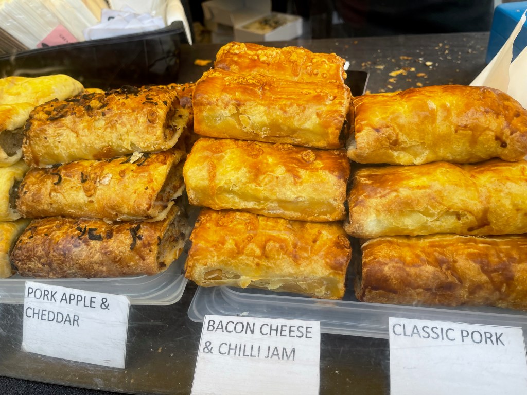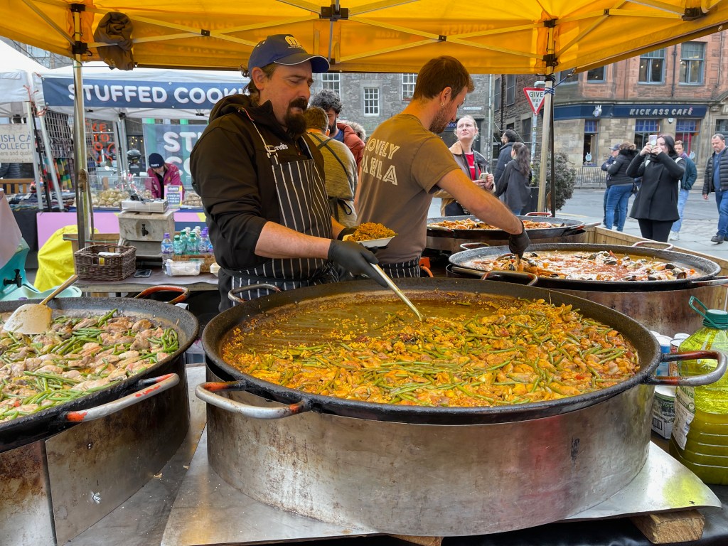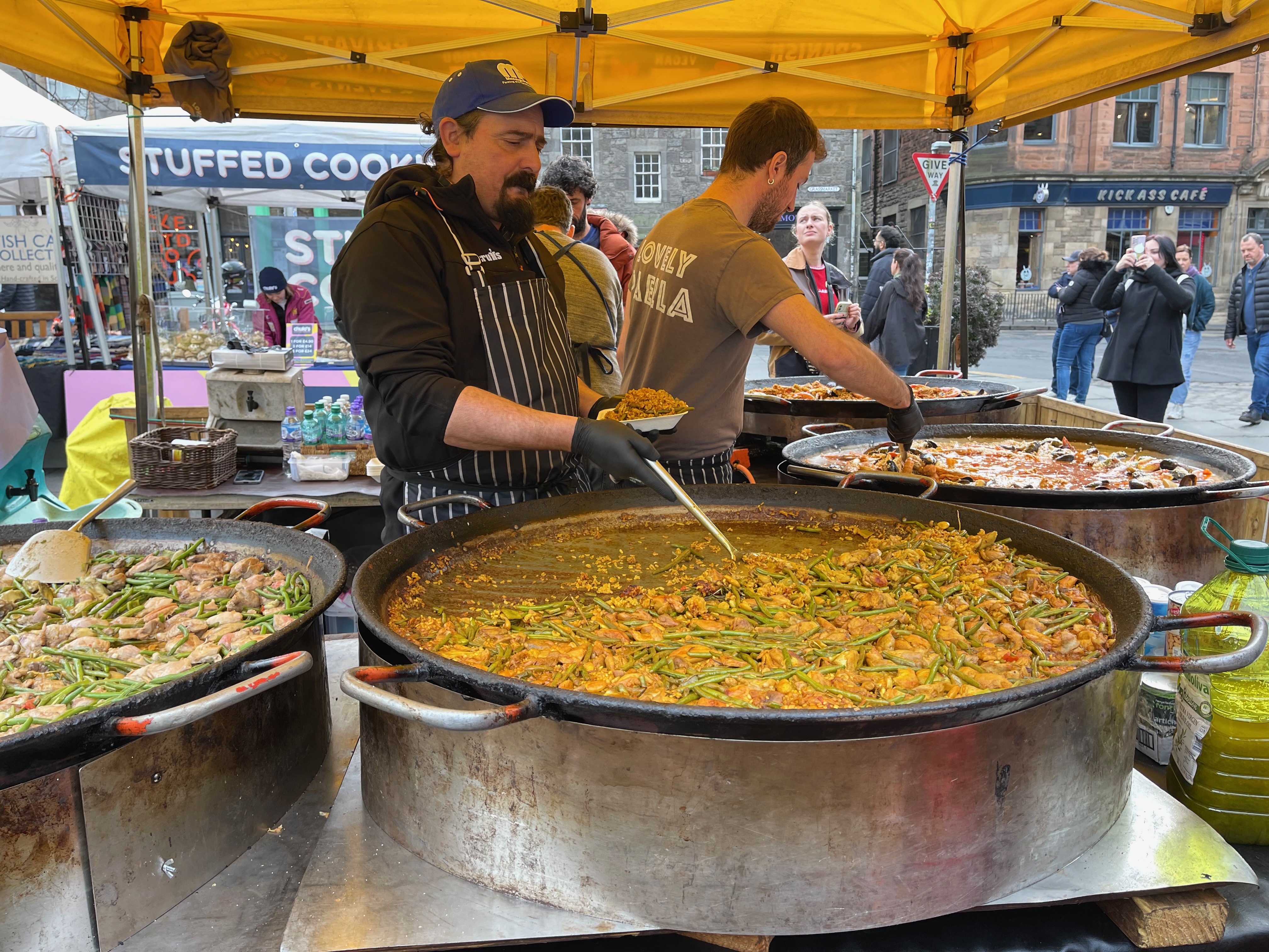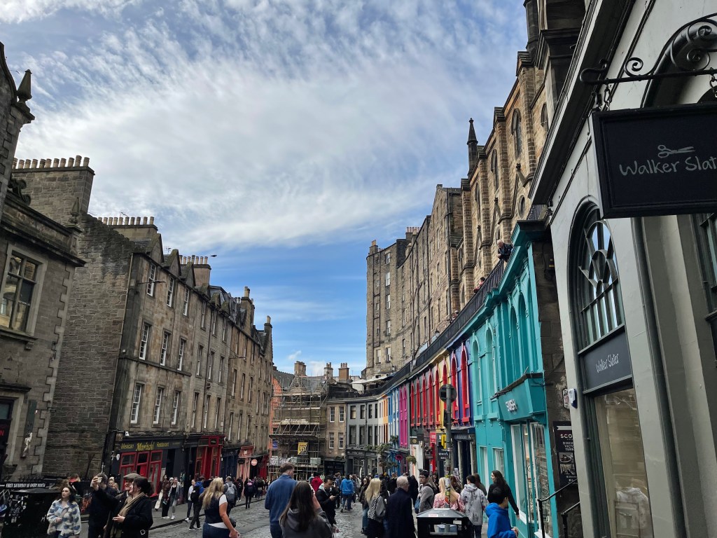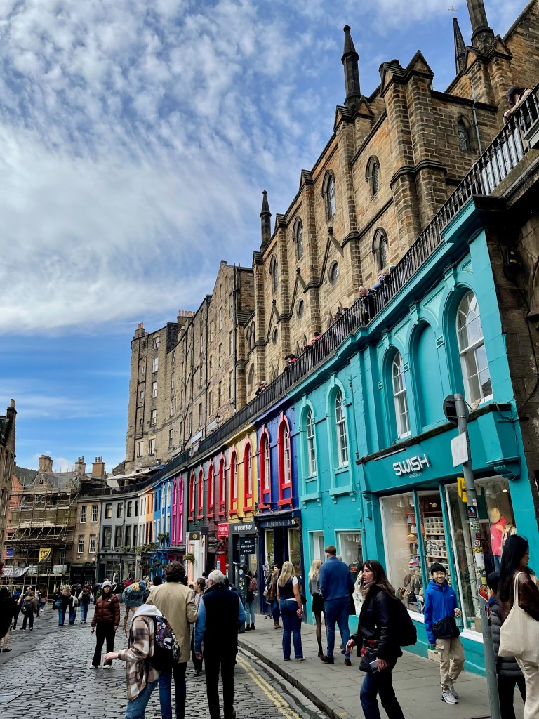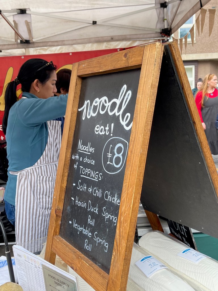 …and onto Grassmarket, where a small market is happening. There are so many people around, despite it being out of season, and we’re again glad we’re not travelling in the summer. We’d skipped breakfast, so we shared an excellent sausage roll (I score it 9/10) and a box of noodles.