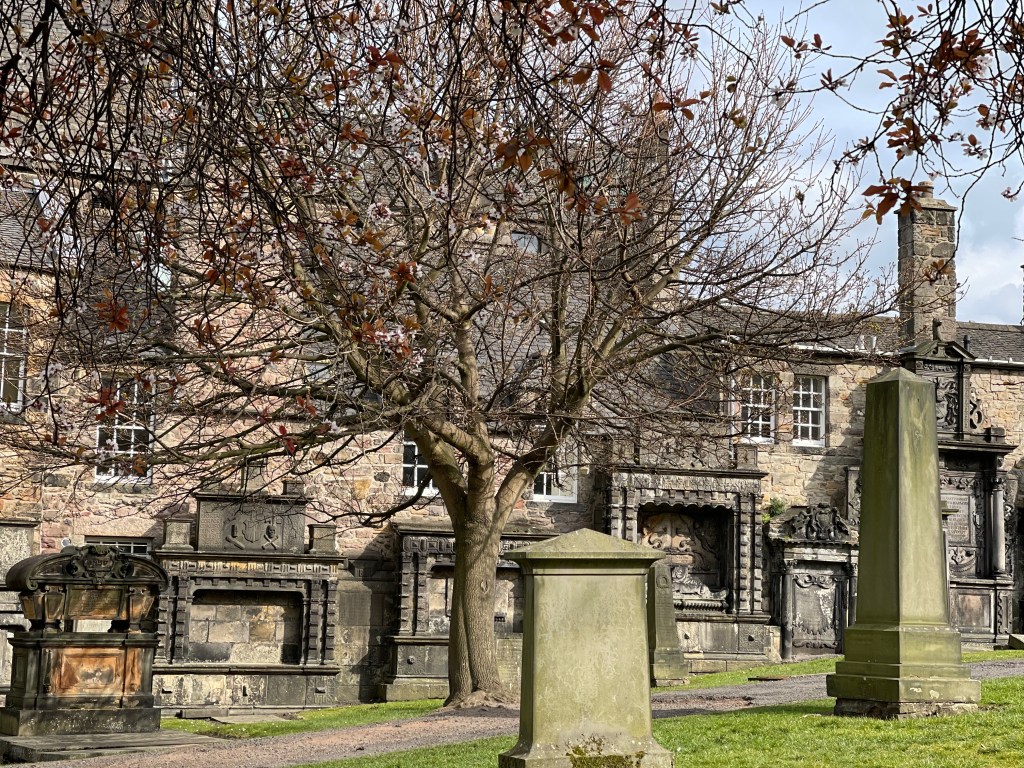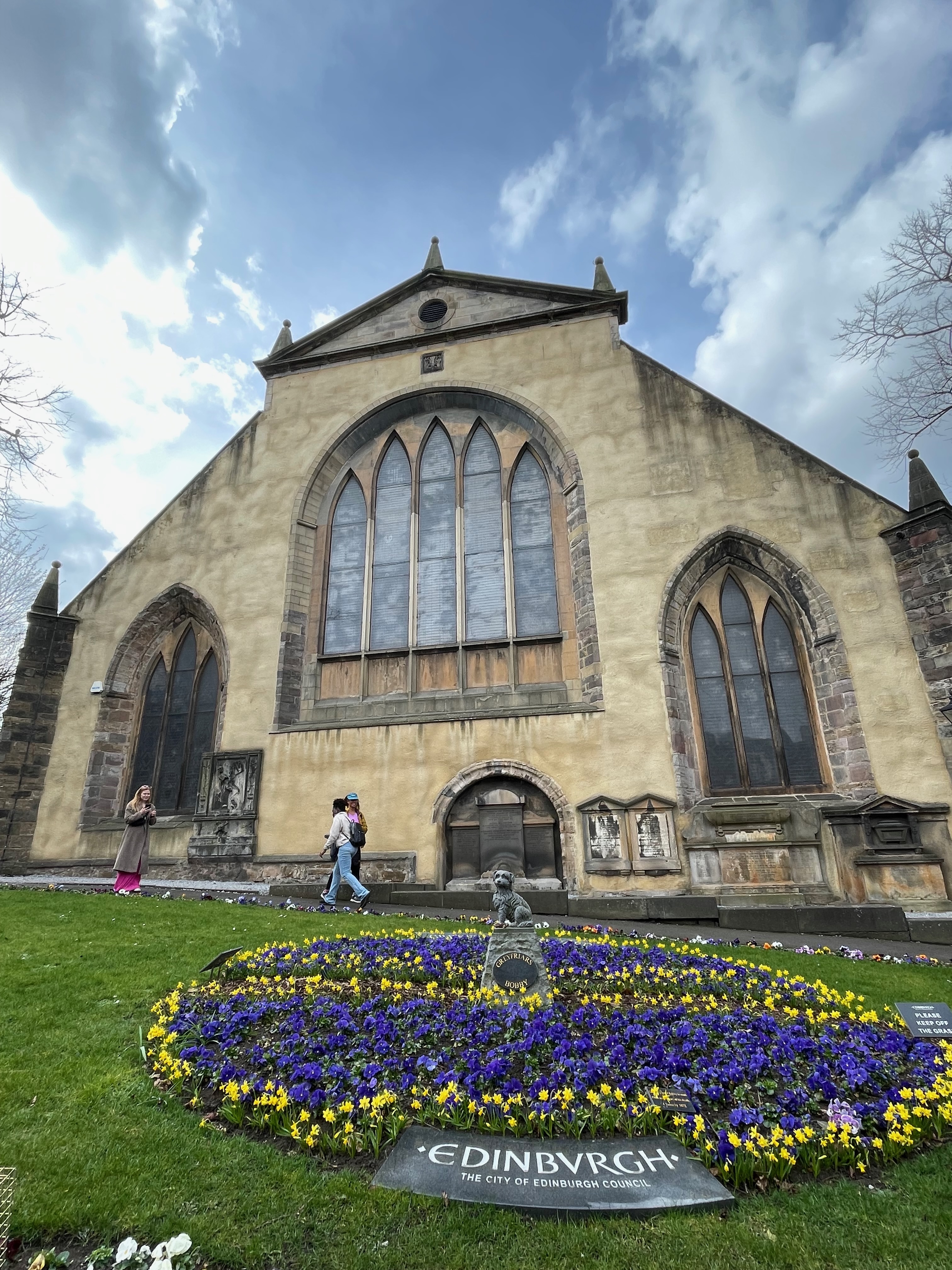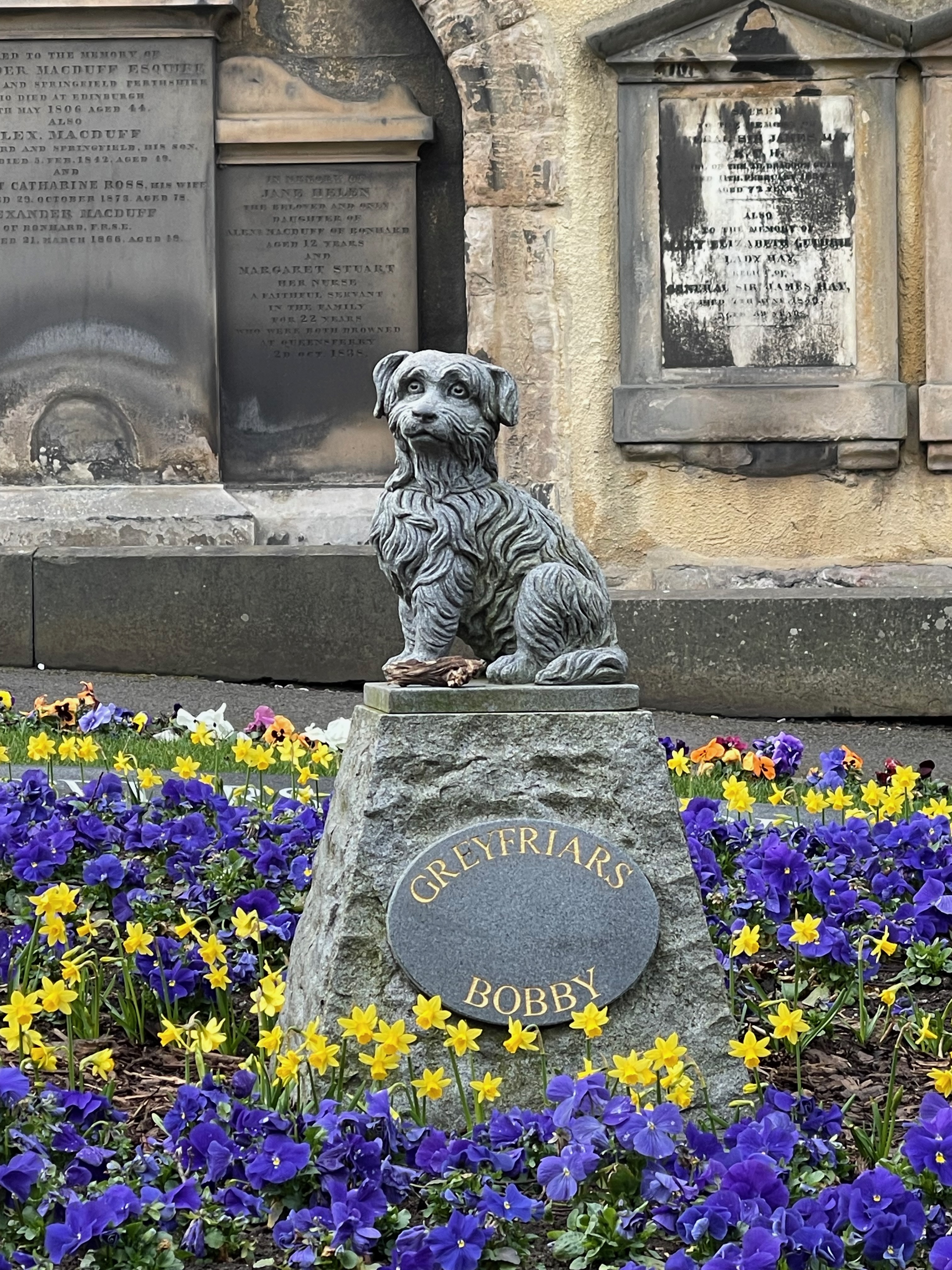 From here, we walked up to Greyfriars Kirkyard and lurked about the edges of a tour group to hear about the story of the little dog, Bobby (Greyfriars Bobby), and the iron grave cages or “mort safes” which were put around the graves to prevent bodysnatching.