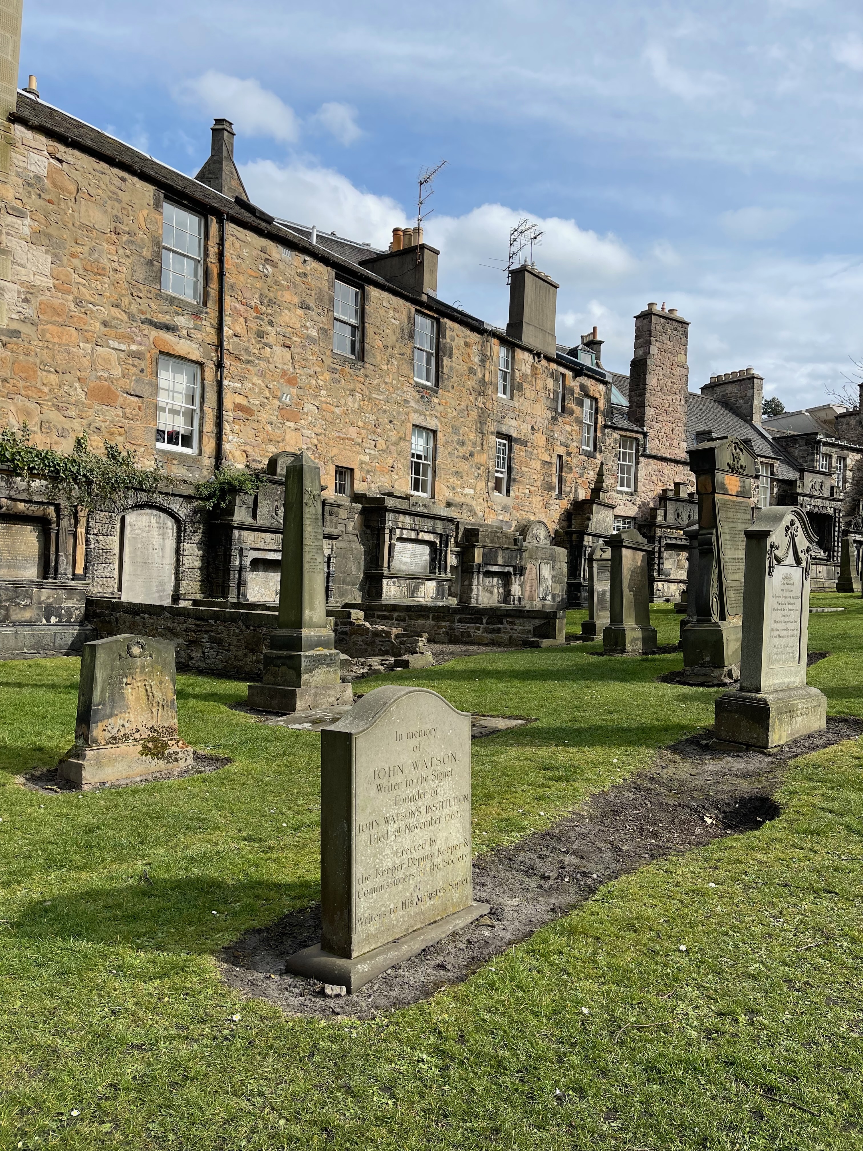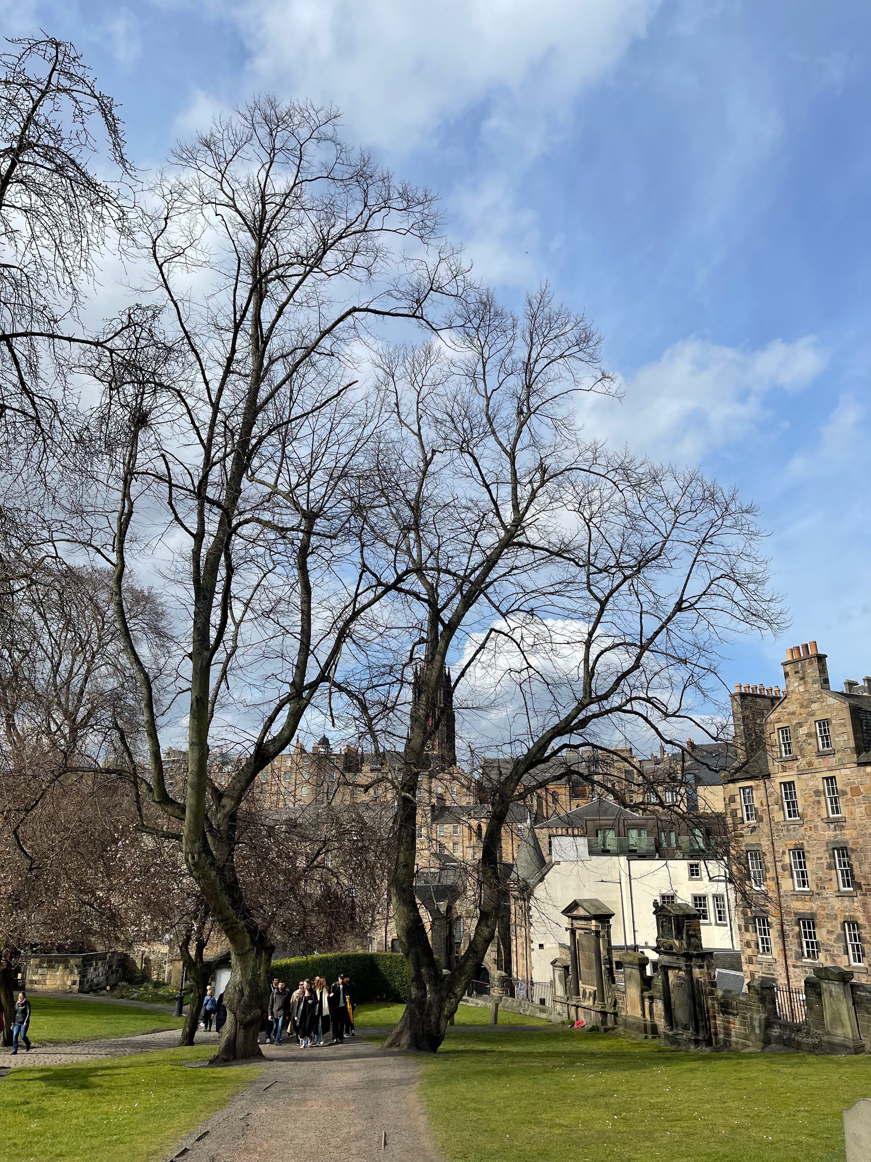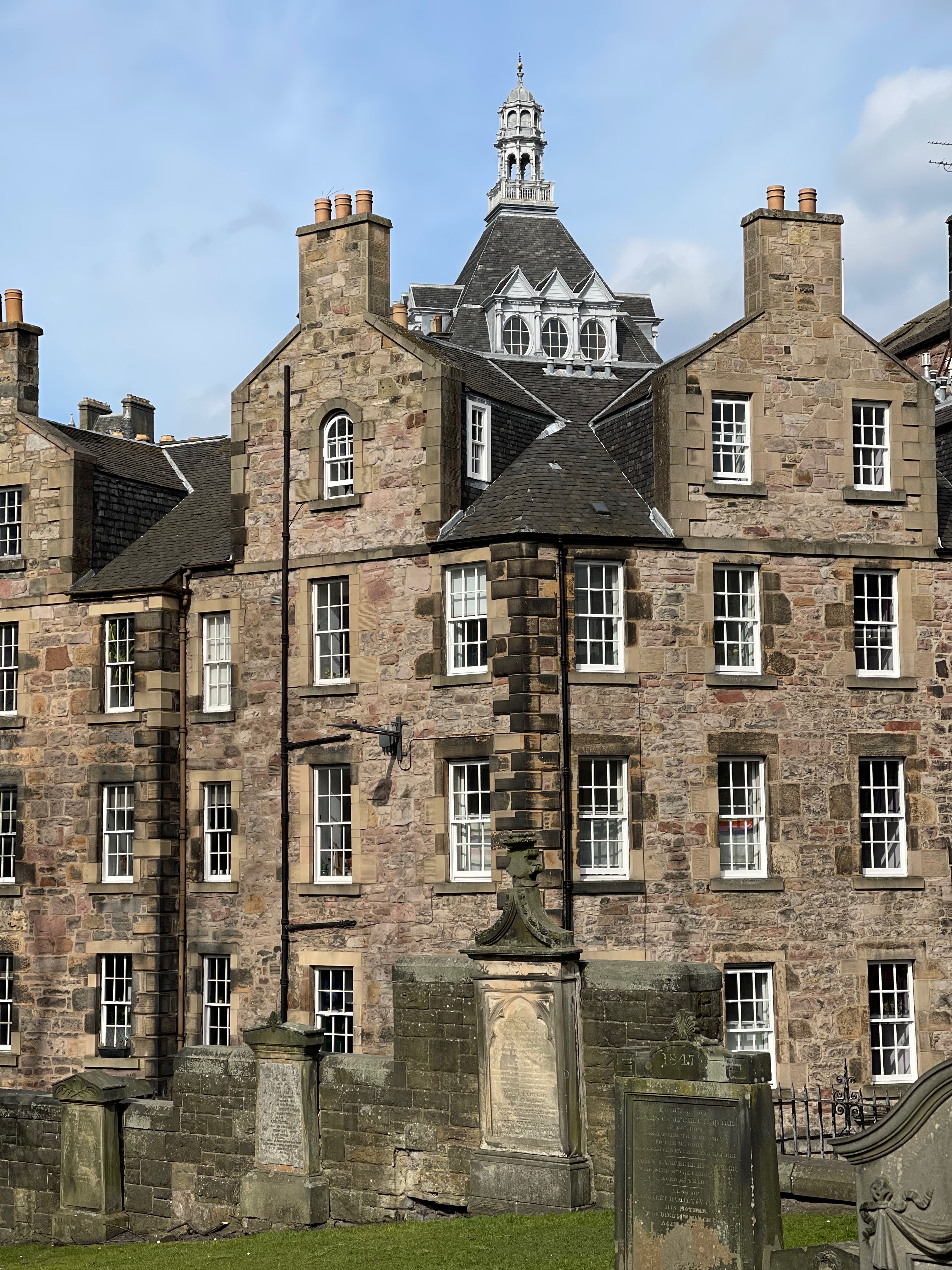 From here, we walked up to Greyfriars Kirkyard and lurked about the edges of a tour group to hear about the story of the little dog, Bobby (Greyfriars Bobby), and the iron grave cages or “mort safes” which were put around the graves to prevent bodysnatching.