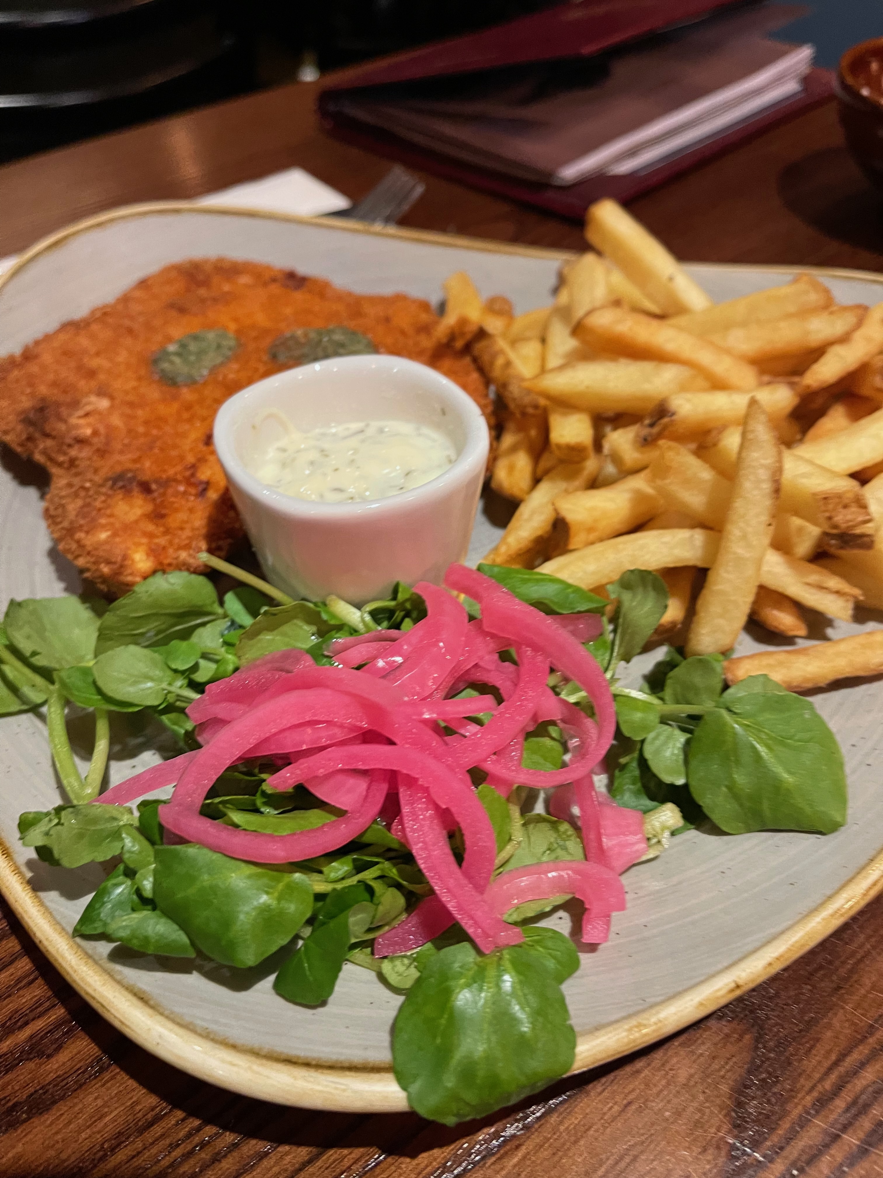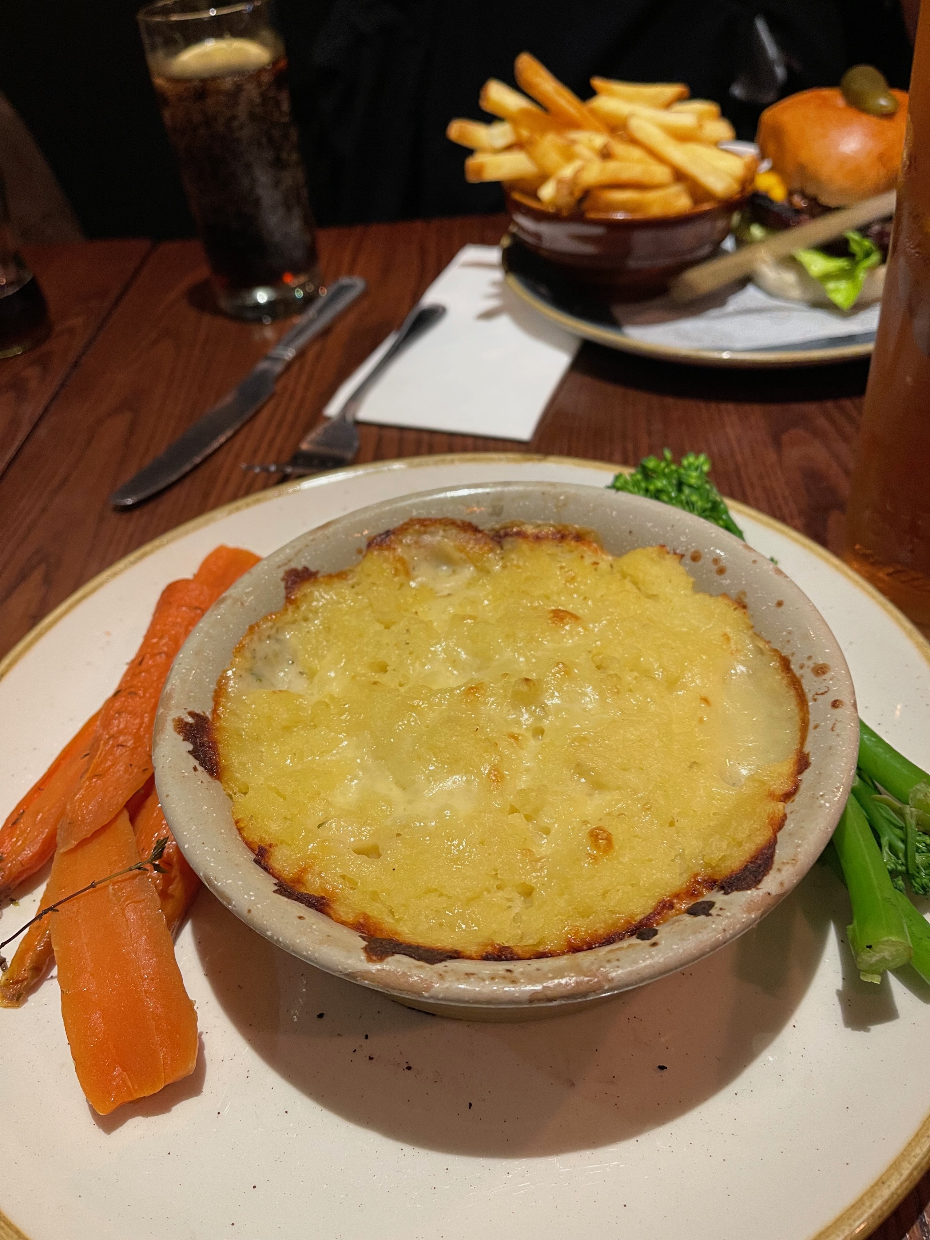 Grant had schnitzel with garlic butter and chips, while I chose a fish pie (with hardly any fish) and carrots and broccolini.