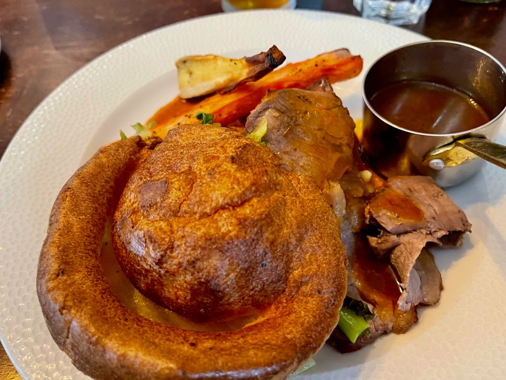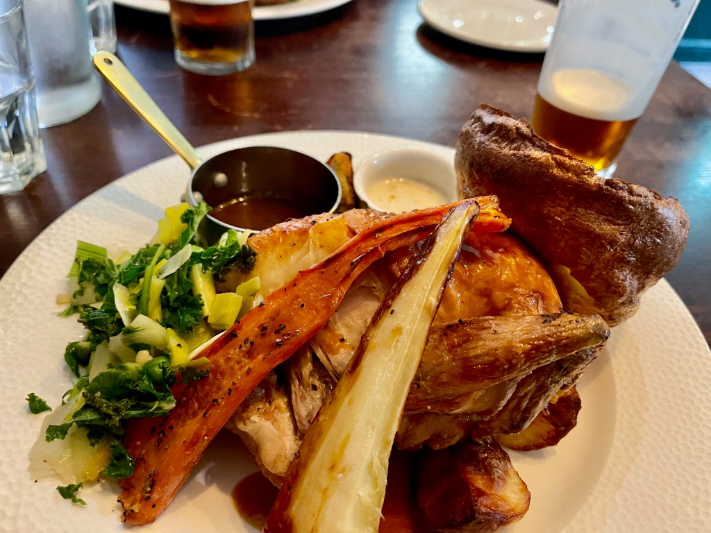 After the effort we’d made to walk there, lunch was good. I had the roast chicken and although the breast meat was a tad dry (as it so often is) it was nothing a decent glug of gravy couldn’t fix. Grant chose the roast beef and helped me out with my chook too. As has been the case each Sunday on this trip, the veg was the star of the show. We shared crumble and custard to finish.