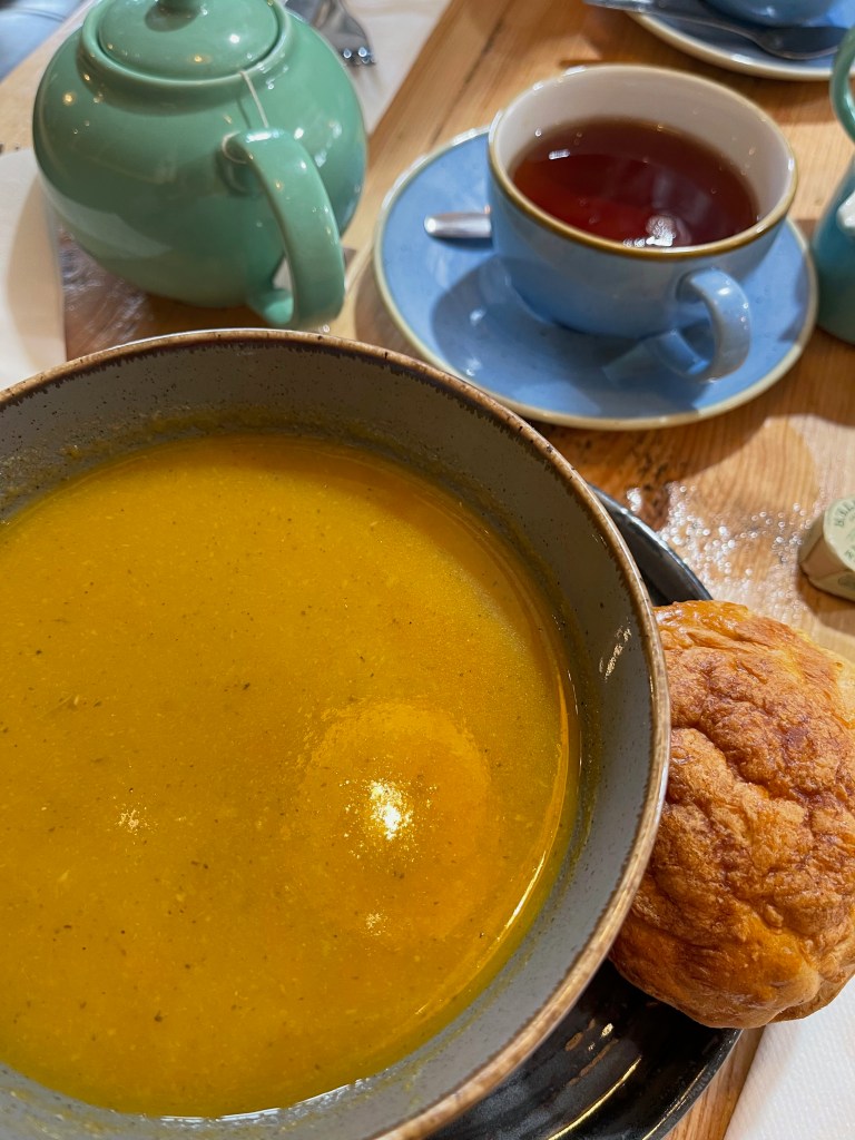 Our lunch stop was in Northumberland at Brocksbushes Farm Shop. I had a vegetable soup that was bland and thin. It came with a cheese scone which was bland and crumbly and held the barest sprinkle of cheese. Feeling generous, I rated it a five. Grant had a Sly Cake which was much better and something I should cook at home.