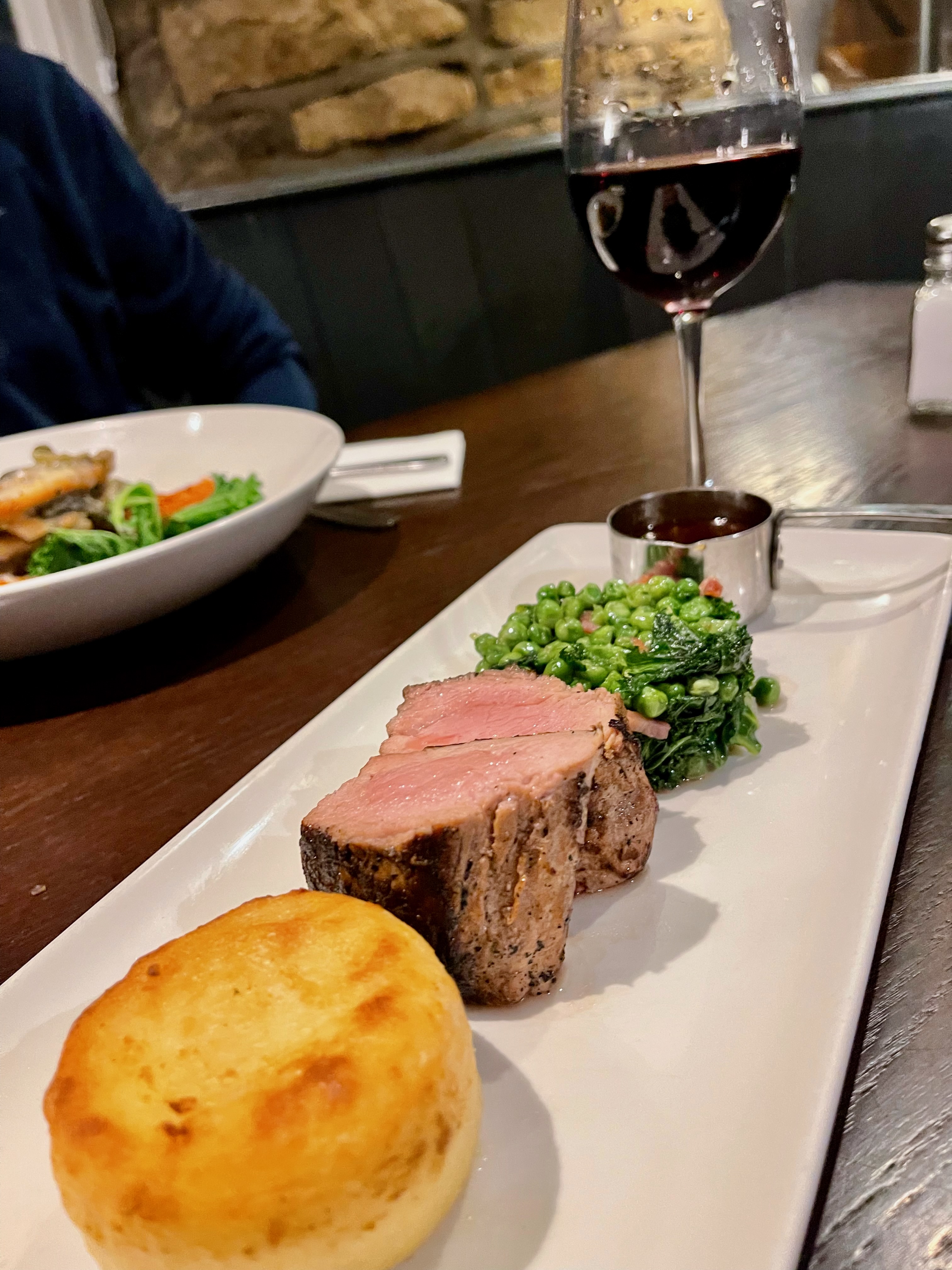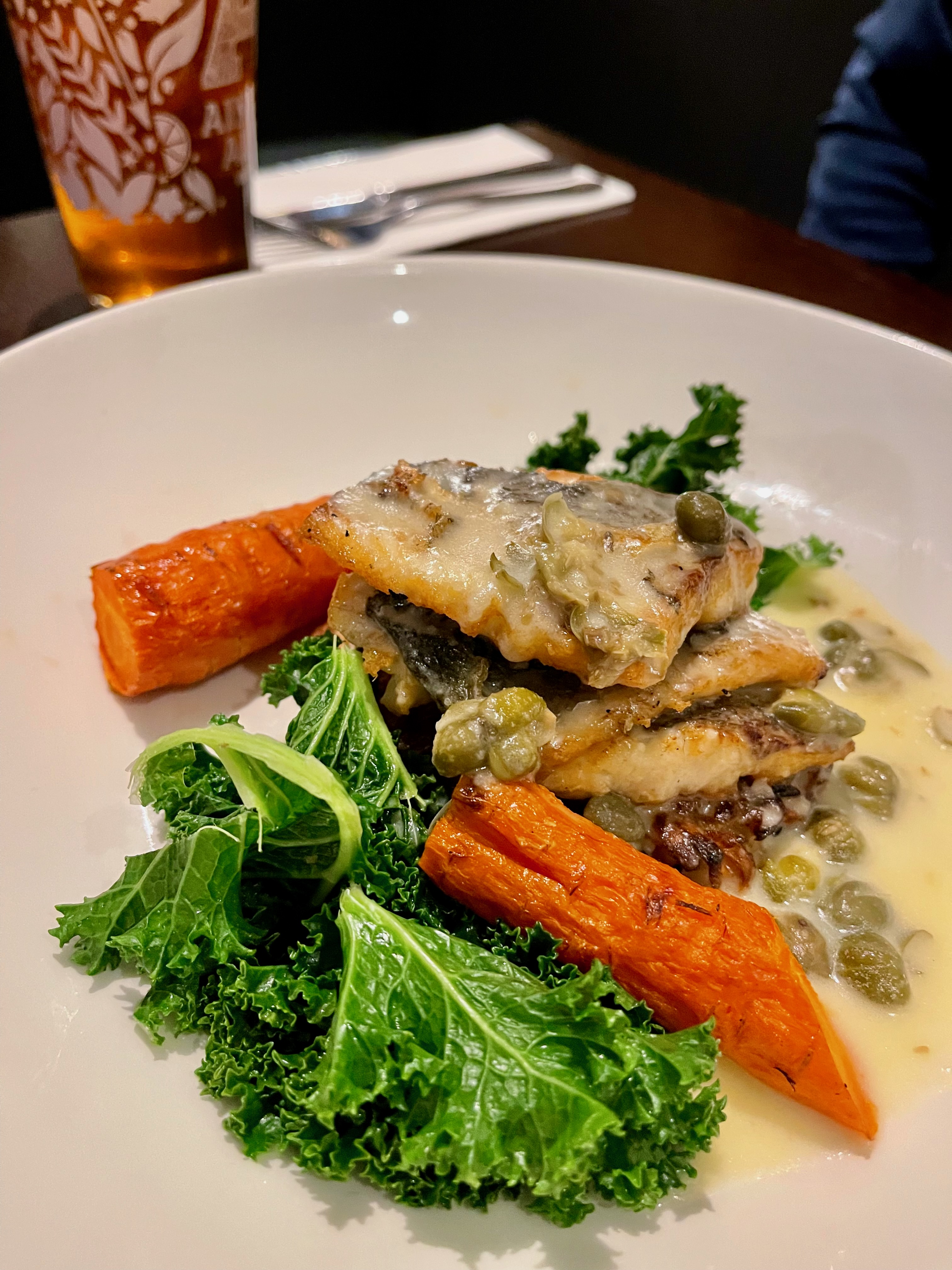We shared a beef carpaccio, and Grant had sea bass with potato rosti and a caper butter sauce. I had pork tenderloin with fondant potatoes and peas with kale and bacon. It was all very lovely and I suspect we’ll be back.