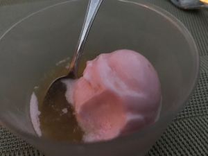 Sorbet au Marc de Champagne – the marc is a brandy made from the discarded skins and seeds in the process of making champagne. It was poured over the sorbet as a very tasty palate cleanser.
